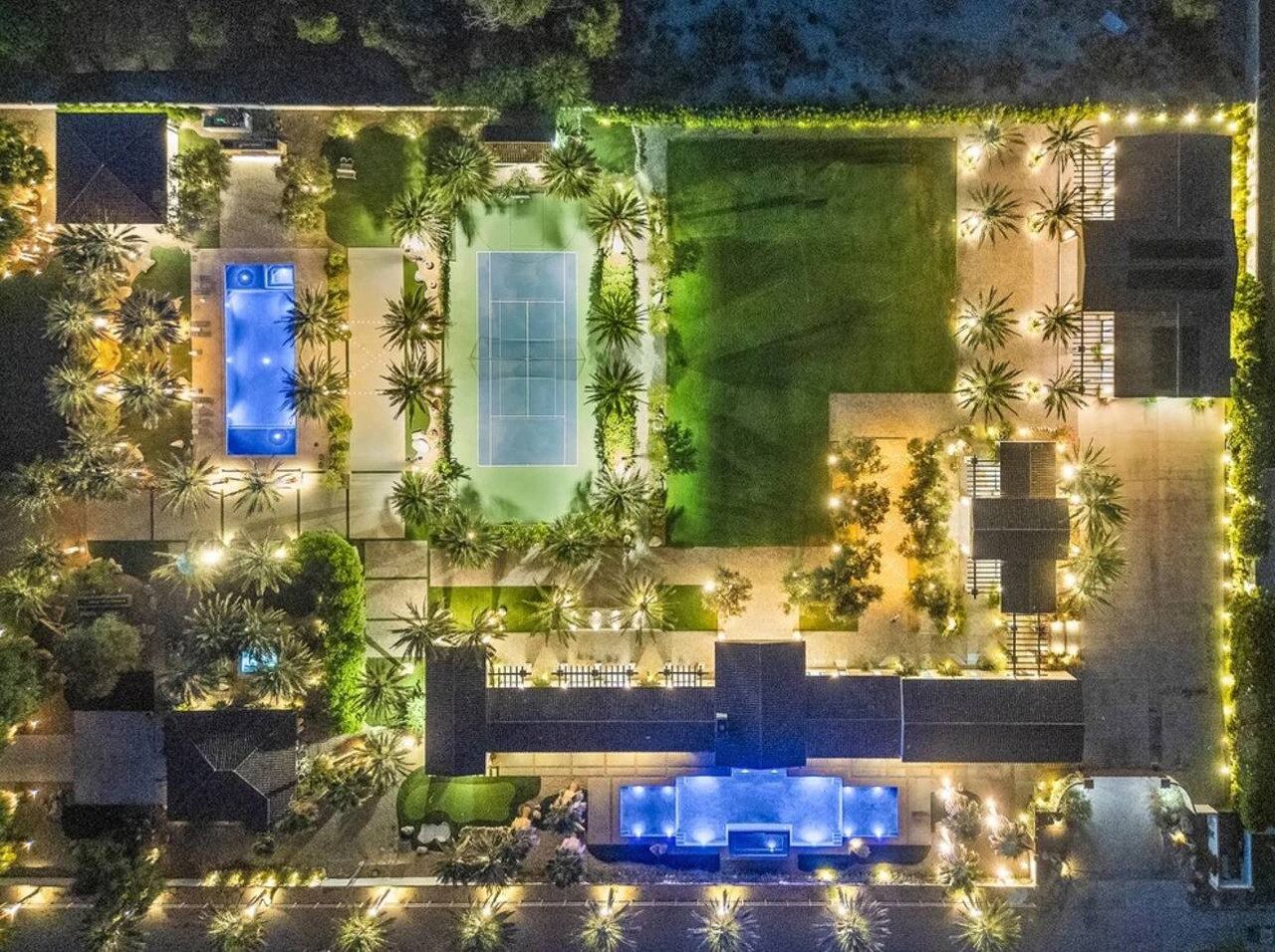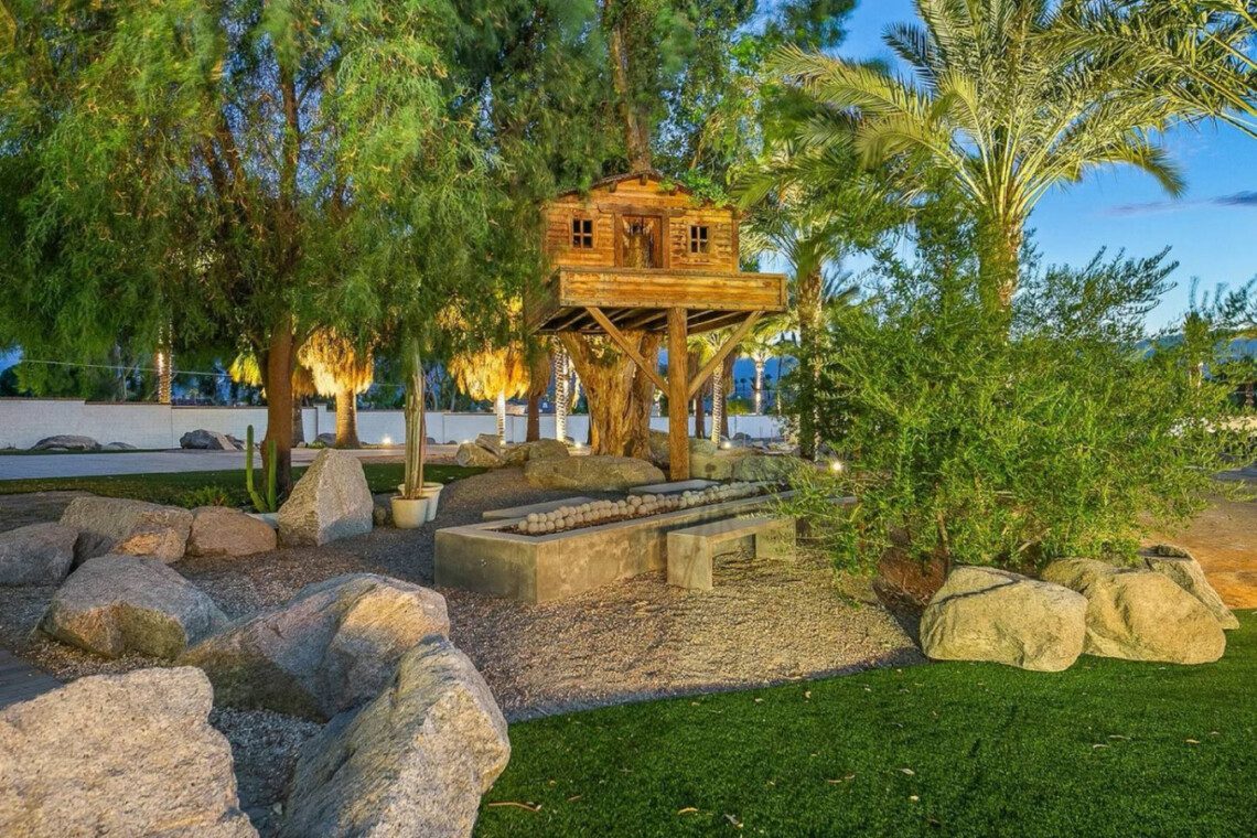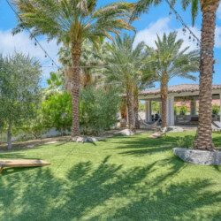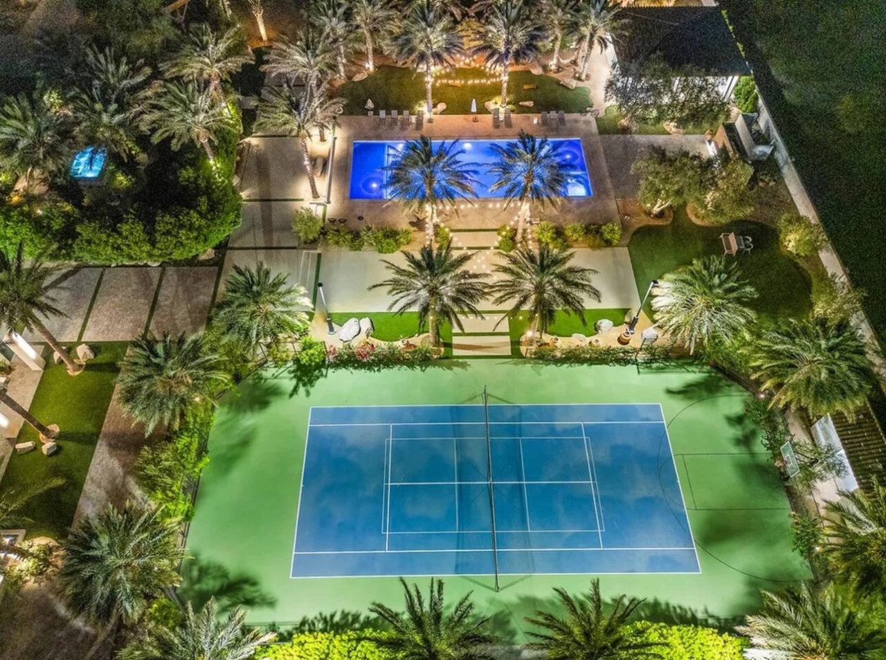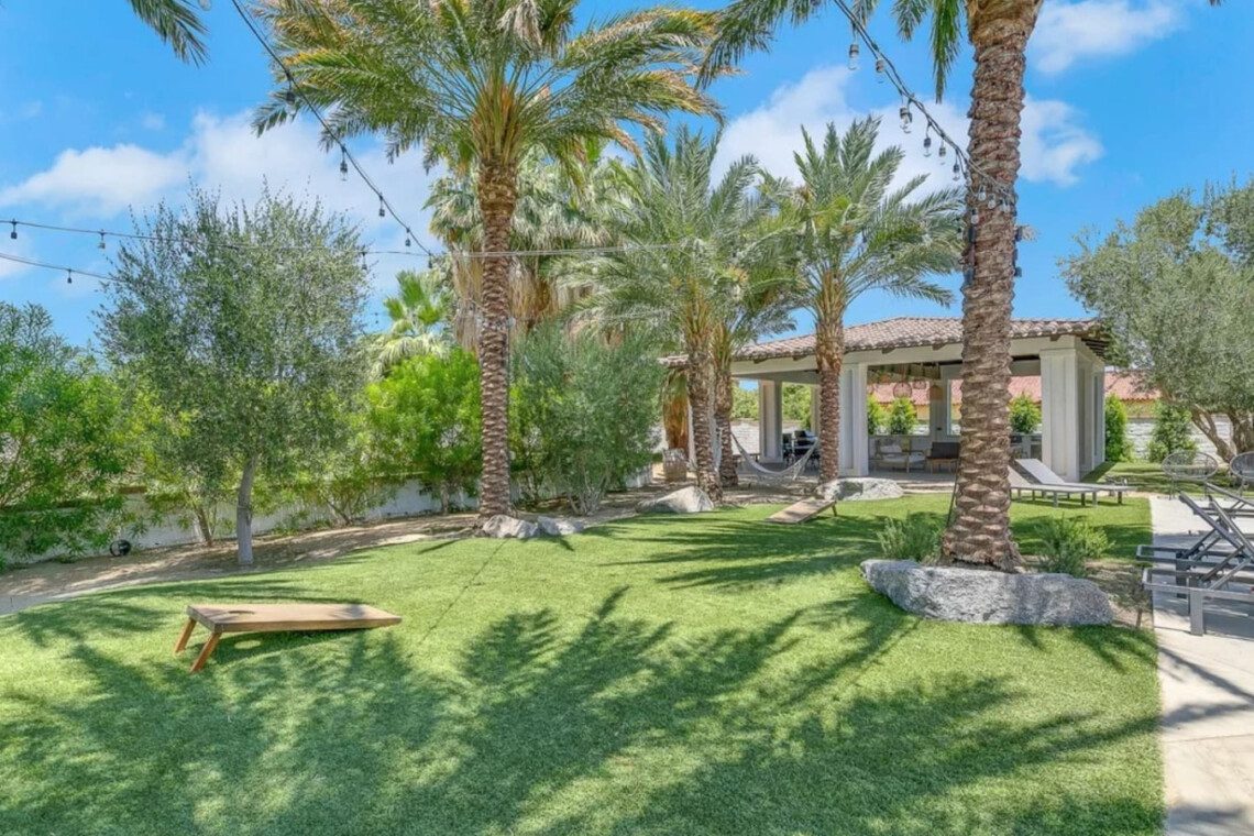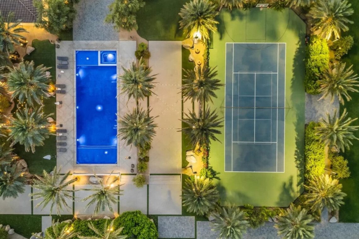 The outdoor grounds are equally impressive, curated for both relaxation and entertainment. Guests can enjoy three resort-style pools (including two expansive pools and an intimate spool), a private tennis court, a putting green, and a charming treehouse. At the heart of the property, a spacious covered gazebo with a built-in BBQ and elegant lounge and dining areas sets the stage for effortless al fresco living—perfect for sun-soaked afternoons or evenings under the desert sky.