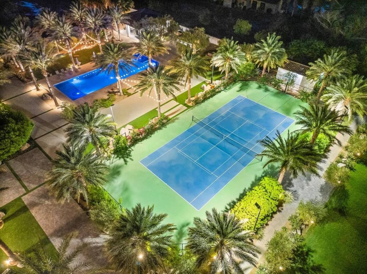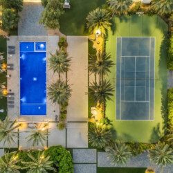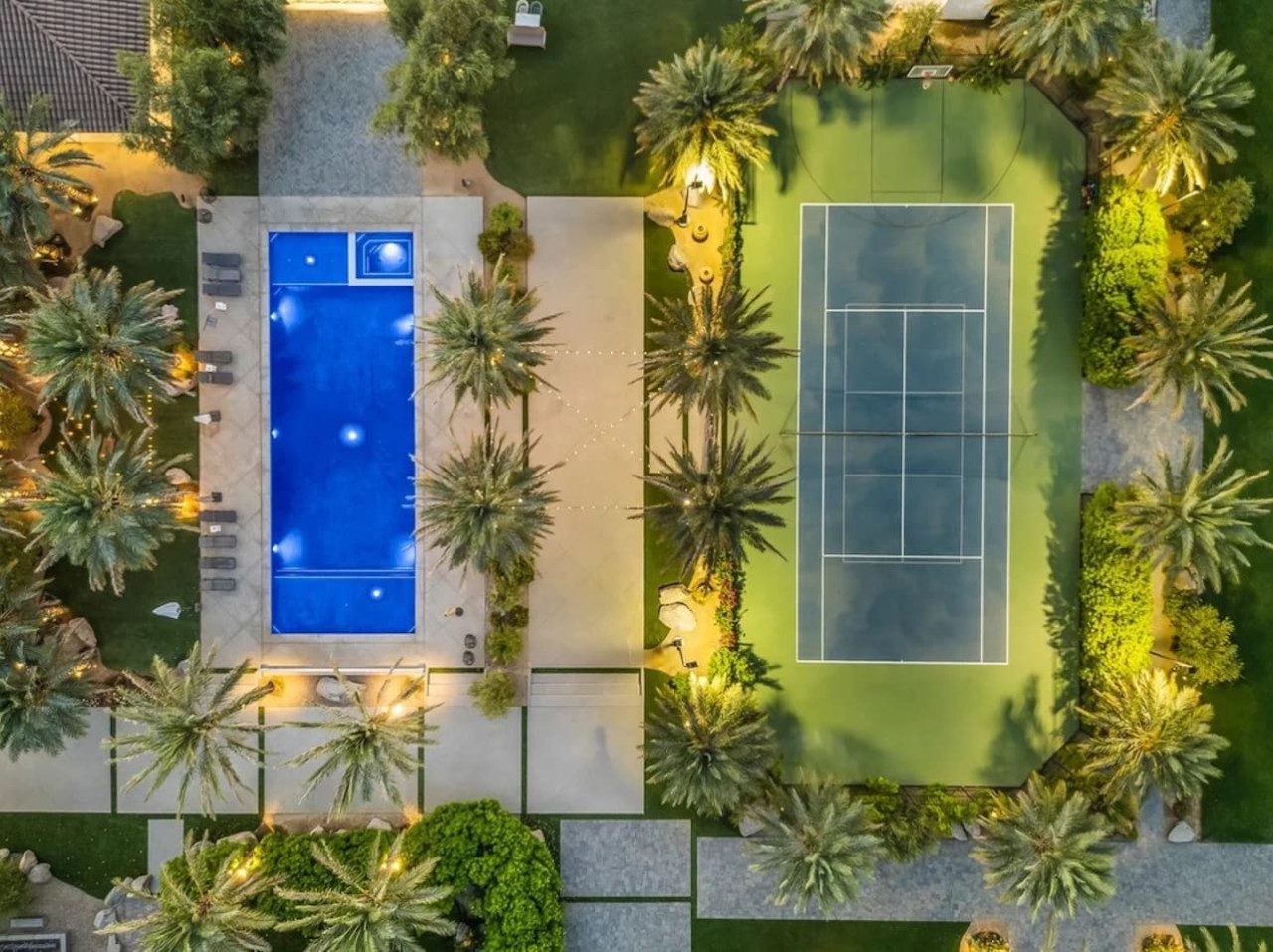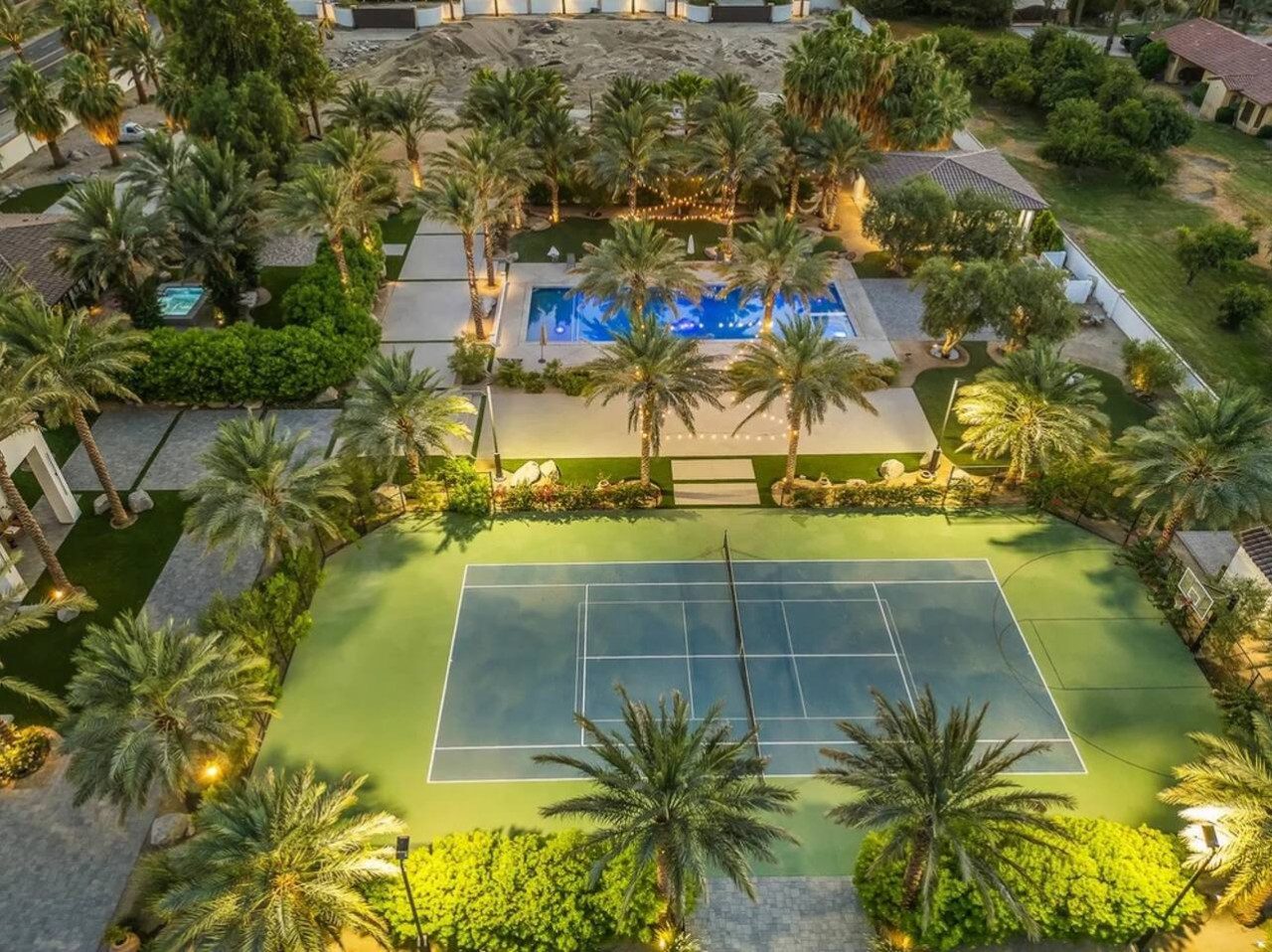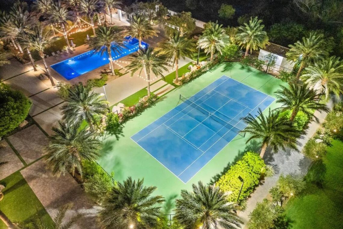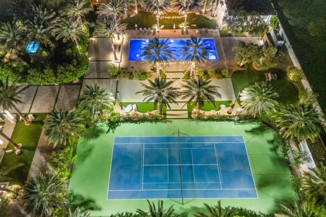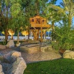 The outdoor grounds are equally impressive, curated for both relaxation and entertainment. Guests can enjoy three resort-style pools (including two expansive pools and an intimate spool), a private tennis court, a putting green, and a charming treehouse. At the heart of the property, a spacious covered gazebo with a built-in BBQ and elegant lounge and dining areas sets the stage for effortless al fresco living—perfect for sun-soaked afternoons or evenings under the desert sky.