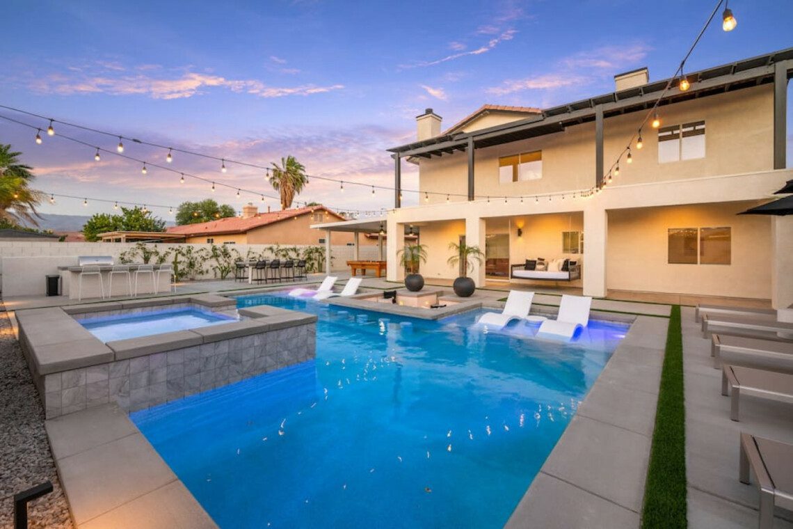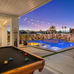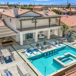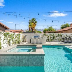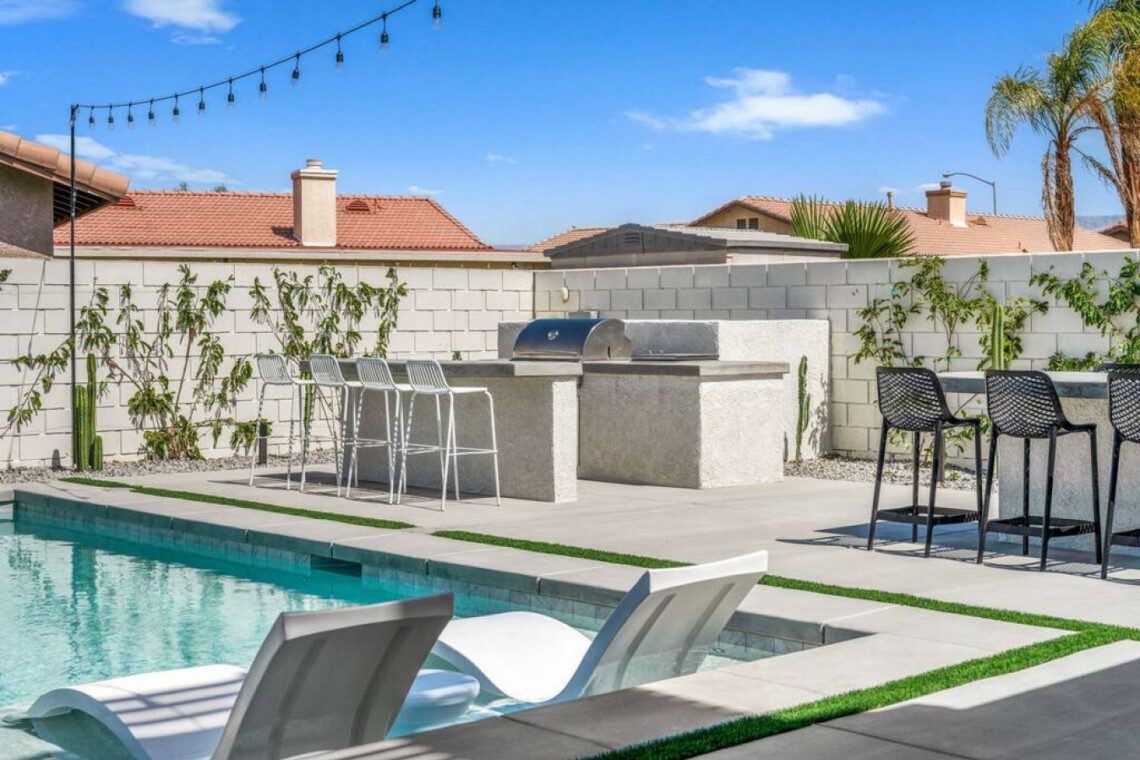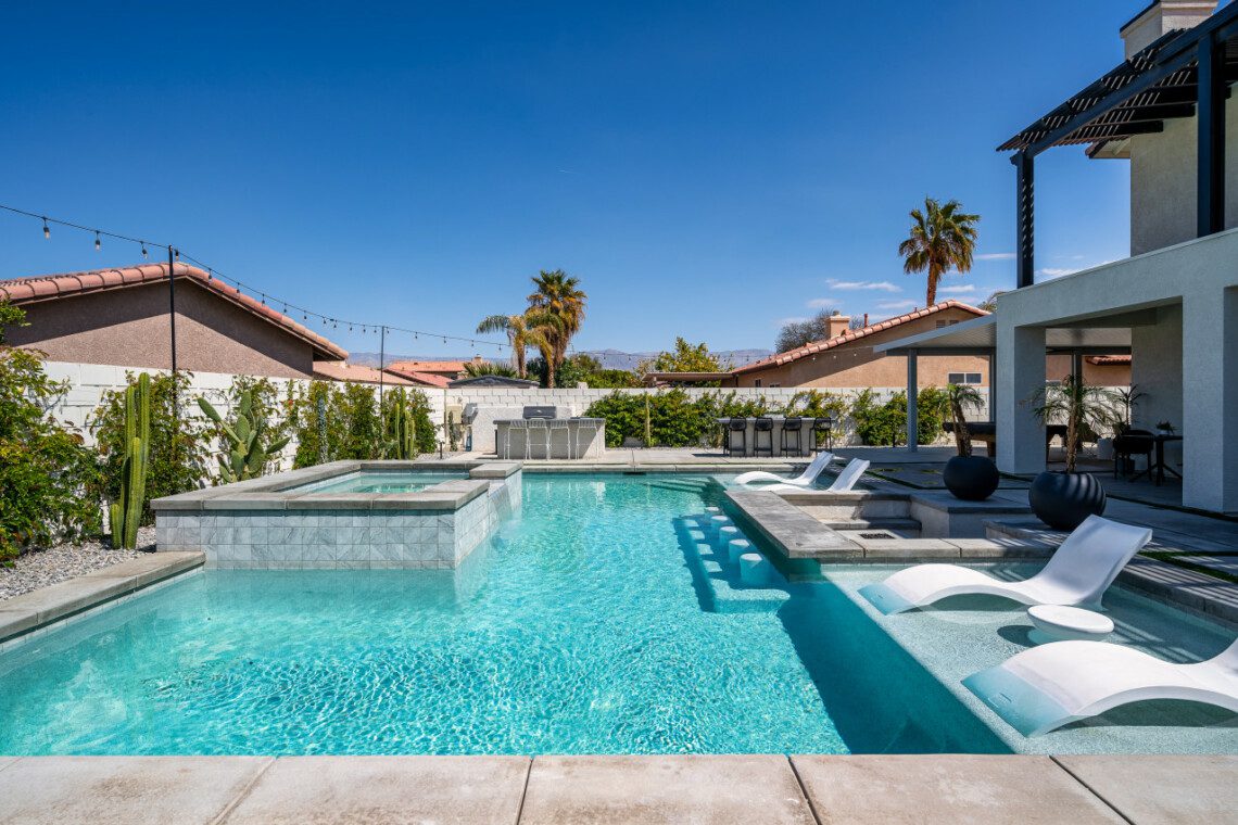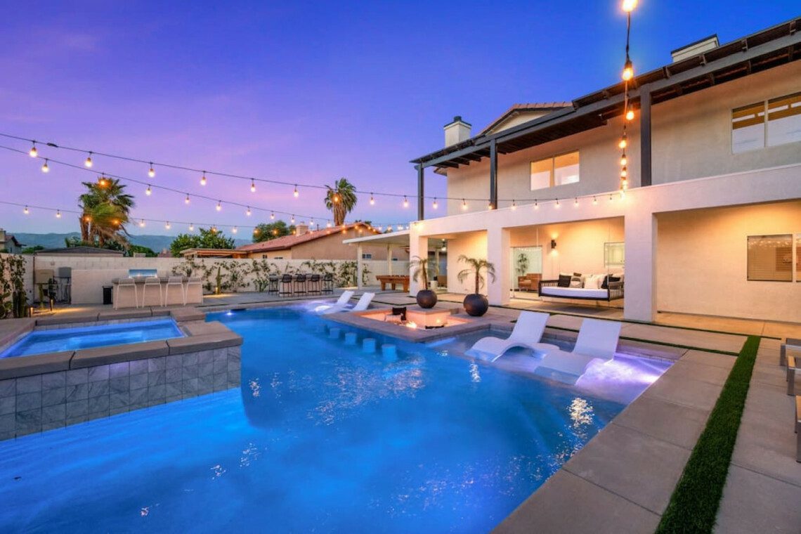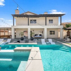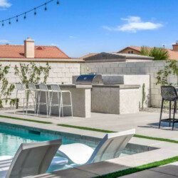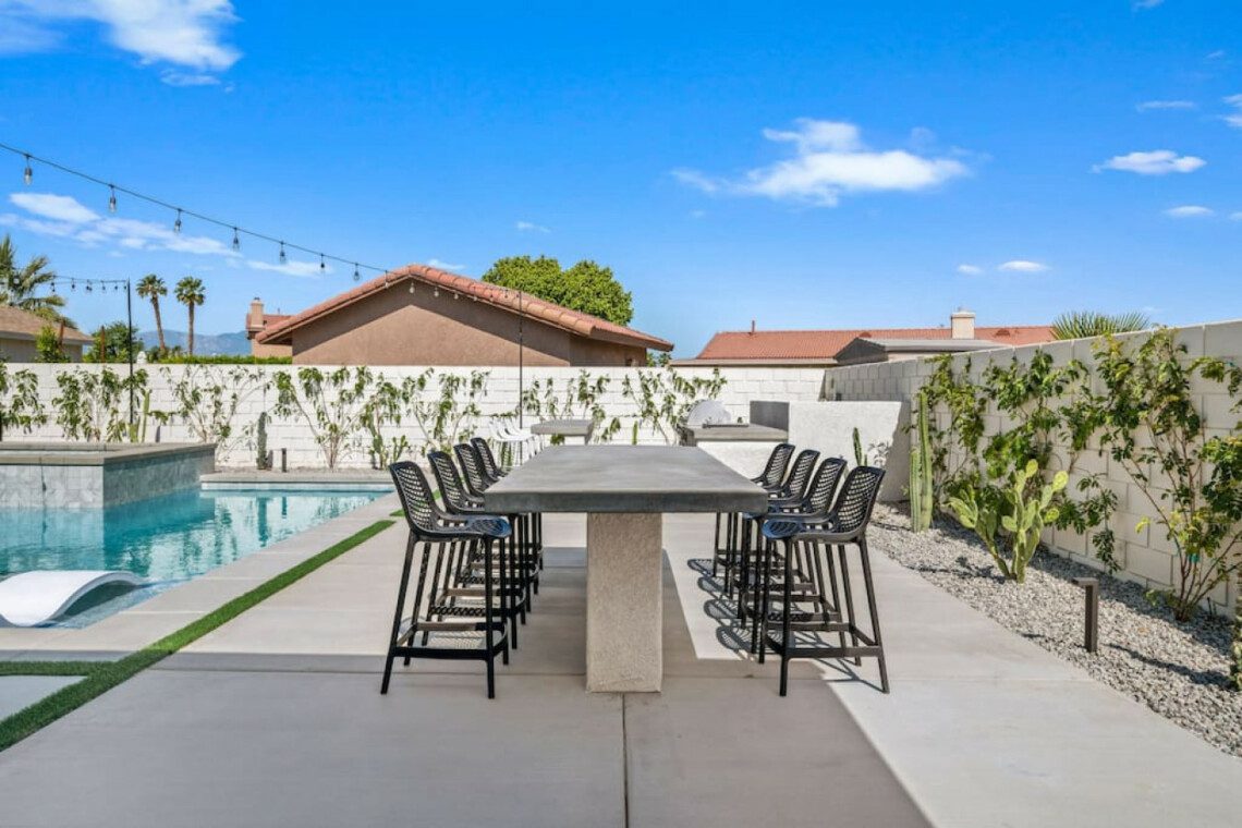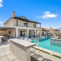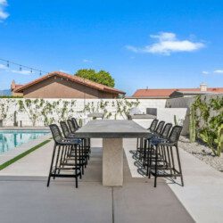 Desert Skyline is located in a quaint neighbor in Indio surrounded by stunning views of the mountains. We have completely renovated the home with vacation rentals in mind. The backyard has been completely gutted and redesigned to create a luxury resort style pool, spa, and sunken fire-pit. The pool was built to allow ample seating for guests to enjoy the pool and 10-person spa while still being close to the fire pit and tanning shelf. Within the pool itself, we have included 5 pool stools to create a swim up bar connecting to the sunken fire pit. We have ensured maximum use of our space to allow for ample seating by adding 4 Lounge Ledger in-pool chaise and 6 additional chaise lounge chairs lined up by the pool. We built a large solid patio cover attached to the side of the home to create space for additional seating and entertainment. The BBQ island with a 32″ Blaze stainless steel grill, wet bar, and dining table is constructed with durable concrete to give the space a raw modern appeal. Simply put, Desert Skyline is the perfect entertainer’s paradise.