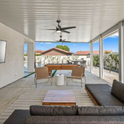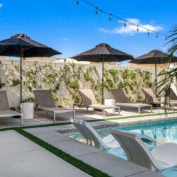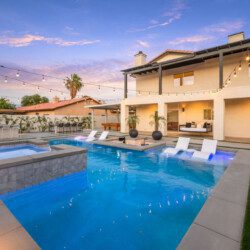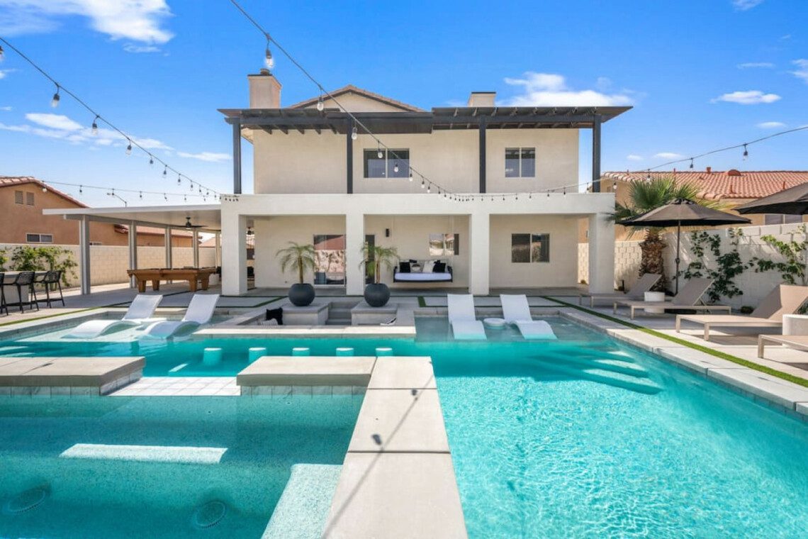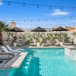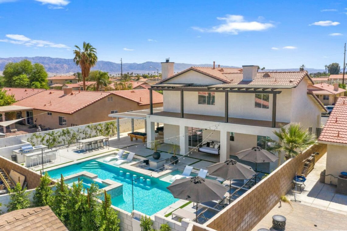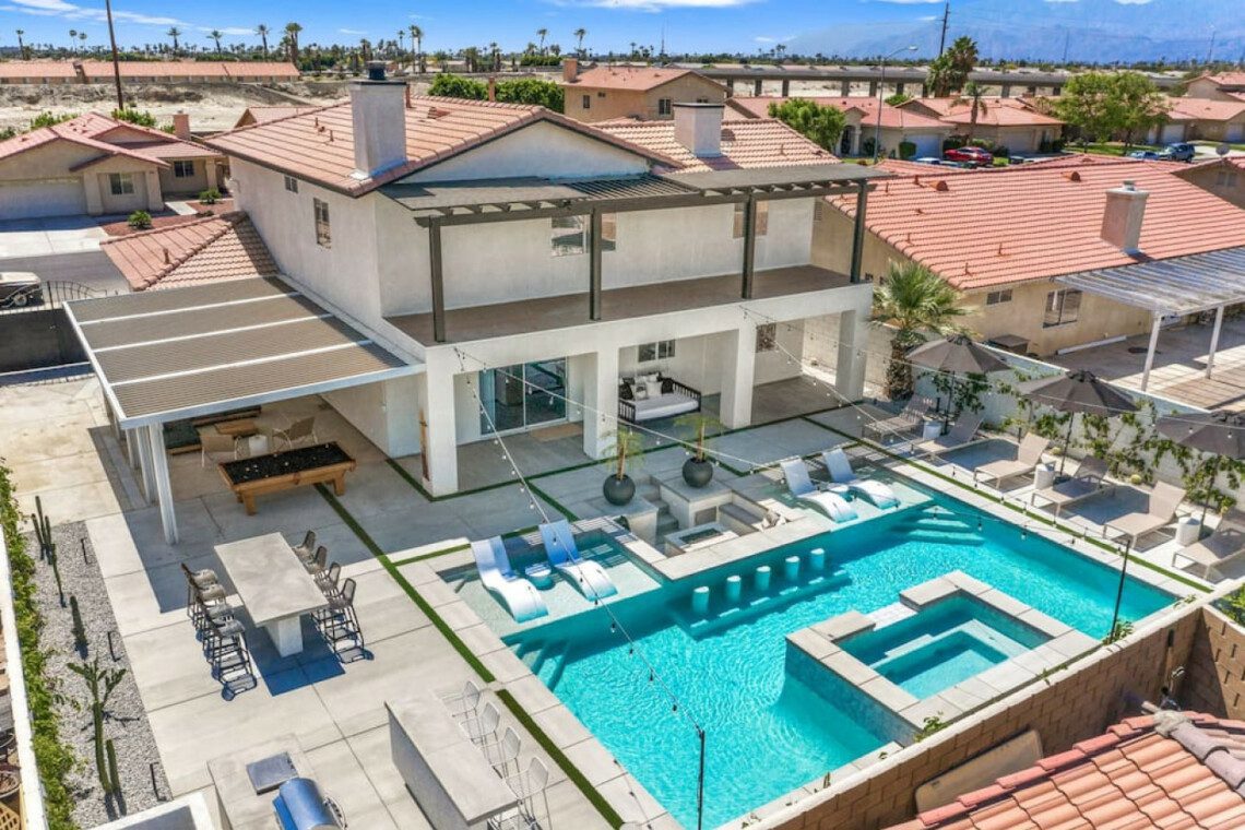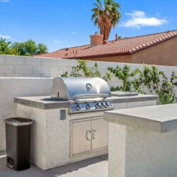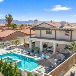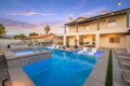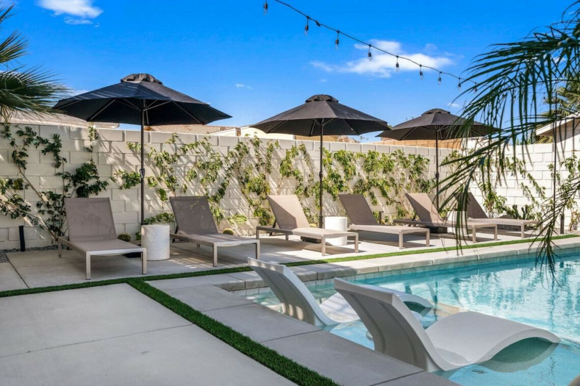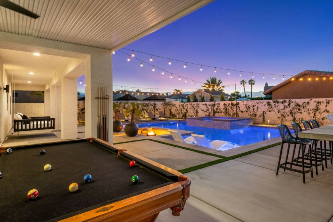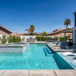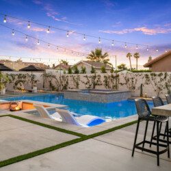 Desert Skyline is located in a quaint neighbor in Indio surrounded by stunning views of the mountains. We have completely renovated the home with vacation rentals in mind. The backyard has been completely gutted and redesigned to create a luxury resort style pool, spa, and sunken fire-pit. The pool was built to allow ample seating for guests to enjoy the pool and 10-person spa while still being close to the fire pit and tanning shelf. Within the pool itself, we have included 5 pool stools to create a swim up bar connecting to the sunken fire pit. We have ensured maximum use of our space to allow for ample seating by adding 4 Lounge Ledger in-pool chaise and 6 additional chaise lounge chairs lined up by the pool. We built a large solid patio cover attached to the side of the home to create space for additional seating and entertainment. The BBQ island with a 32″ Blaze stainless steel grill, wet bar, and dining table is constructed with durable concrete to give the space a raw modern appeal. Simply put, Desert Skyline is the perfect entertainer’s paradise.
