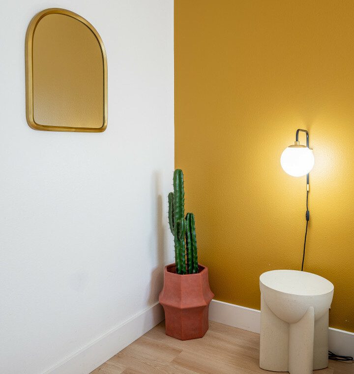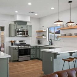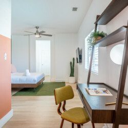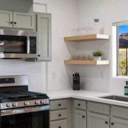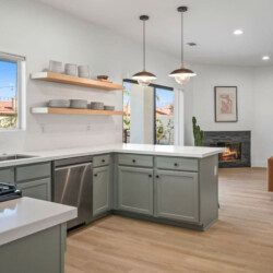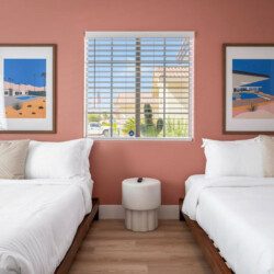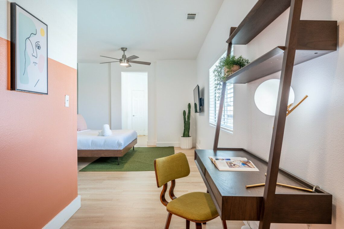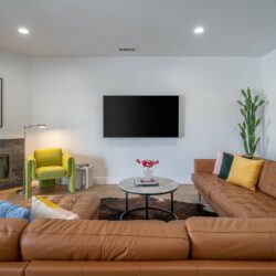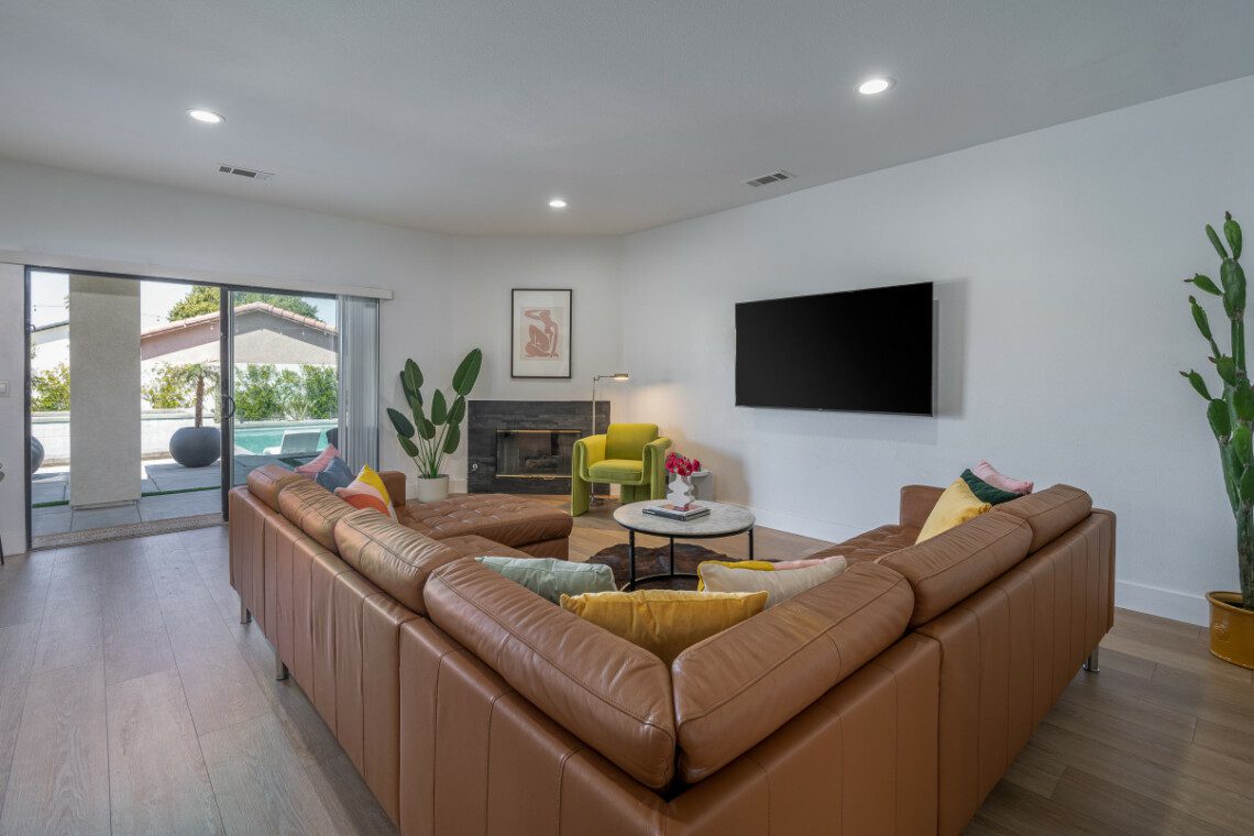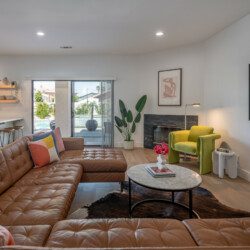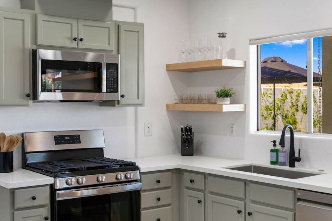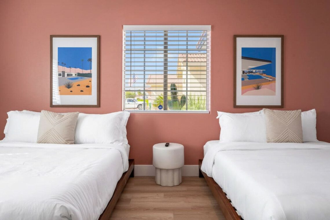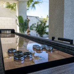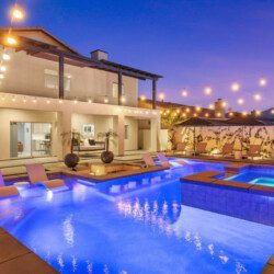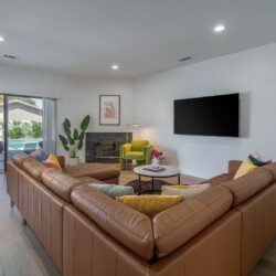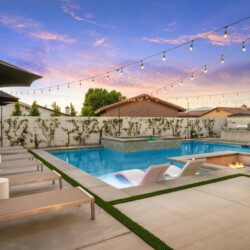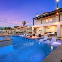 Desert Skyline is located in a quaint neighbor in Indio surrounded by stunning views of the mountains. We have completely renovated the home with vacation rentals in mind. The backyard has been completely gutted and redesigned to create a luxury resort style pool, spa, and sunken fire-pit. The pool was built to allow ample seating for guests to enjoy the pool and 10-person spa while still being close to the fire pit and tanning shelf. Within the pool itself, we have included 5 pool stools to create a swim up bar connecting to the sunken fire pit. We have ensured maximum use of our space to allow for ample seating by adding 4 Lounge Ledger in-pool chaise and 6 additional chaise lounge chairs lined up by the pool. We built a large solid patio cover attached to the side of the home to create space for additional seating and entertainment. The BBQ island with a 32″ Blaze stainless steel grill, wet bar, and dining table is constructed with durable concrete to give the space a raw modern appeal. Simply put, Desert Skyline is the perfect entertainer’s paradise.