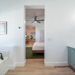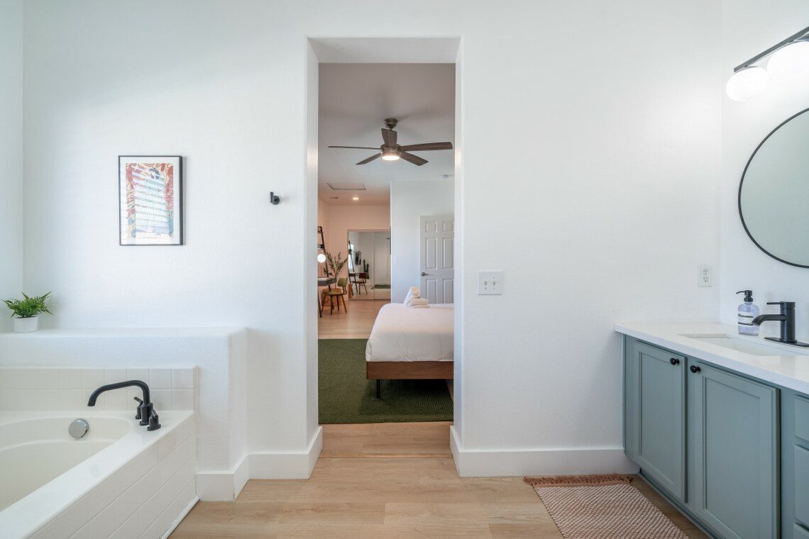 ●Bedroom #1 (primary): King bed with built-in nightstands, ensuite bathroom with tub, table lamps, 50″ smart tv, designated work space, ceiling fan, closet, luggage rack, *upstairs