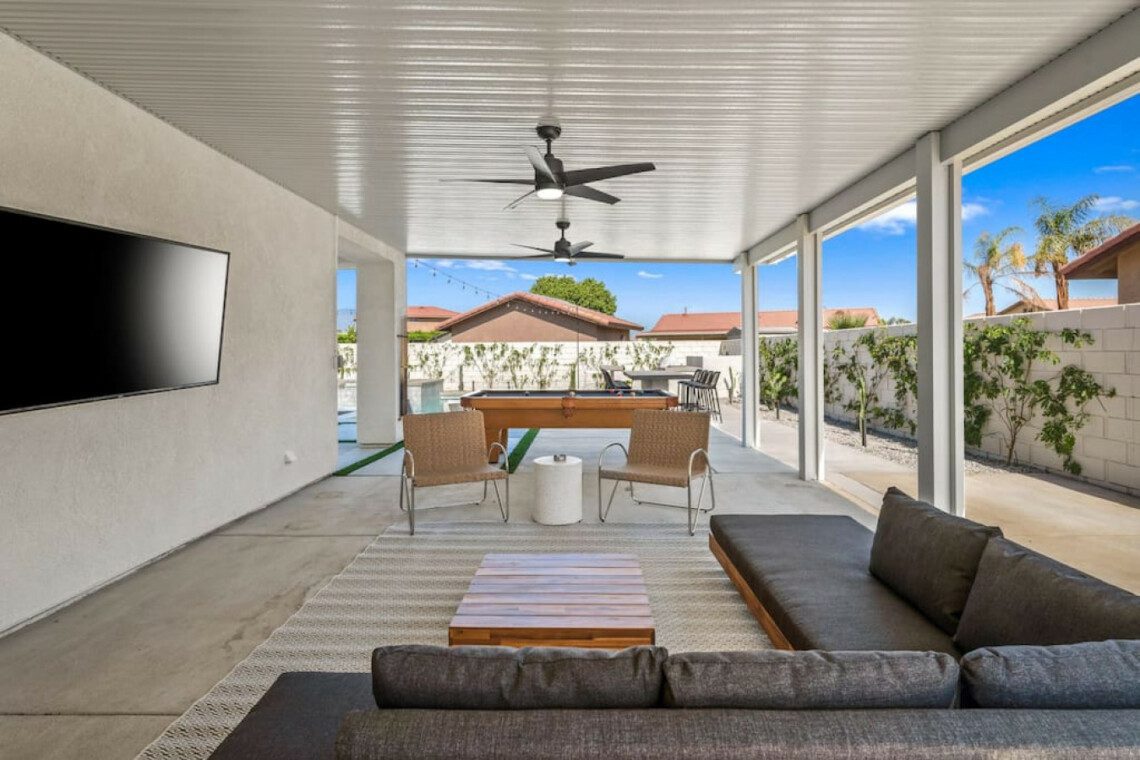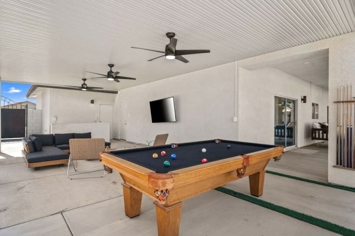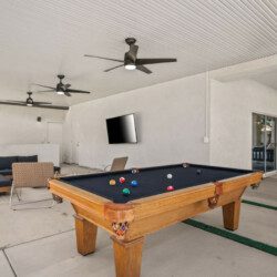 ●Large Shaded Pergola: Conversation sectional, 75″ smart TV, 8ft pool table, shuffle board, ceiling fans