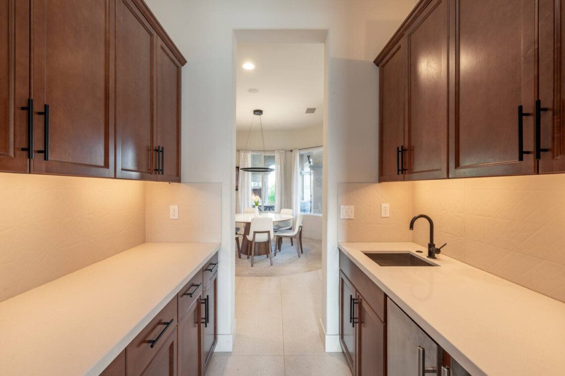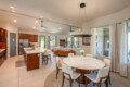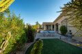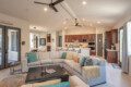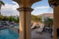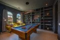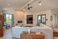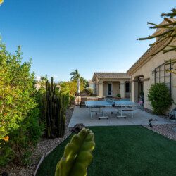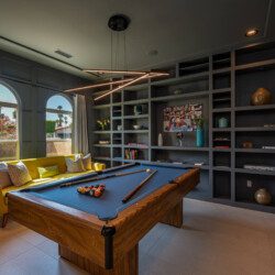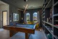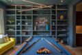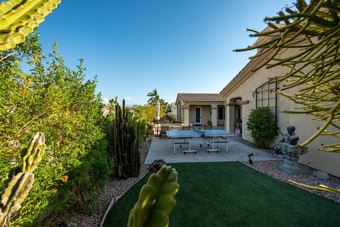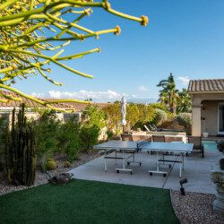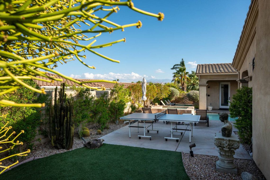 At the center of the home is a beautiful courtyard-style backyard with a sparkling pool and spa, accessible from multiple rooms for easy indoor-outdoor living. Step out from the kitchen to the BBQ area with a stainless steel grill and additional seating. Soak up the sun on one of the many lounge chairs, gather around the outdoor fireplace in the evening, or share a meal under the stars at the outdoor dining table for eight. For daytime fun, guests can enjoy a professional-grade ping pong table and a putting green.