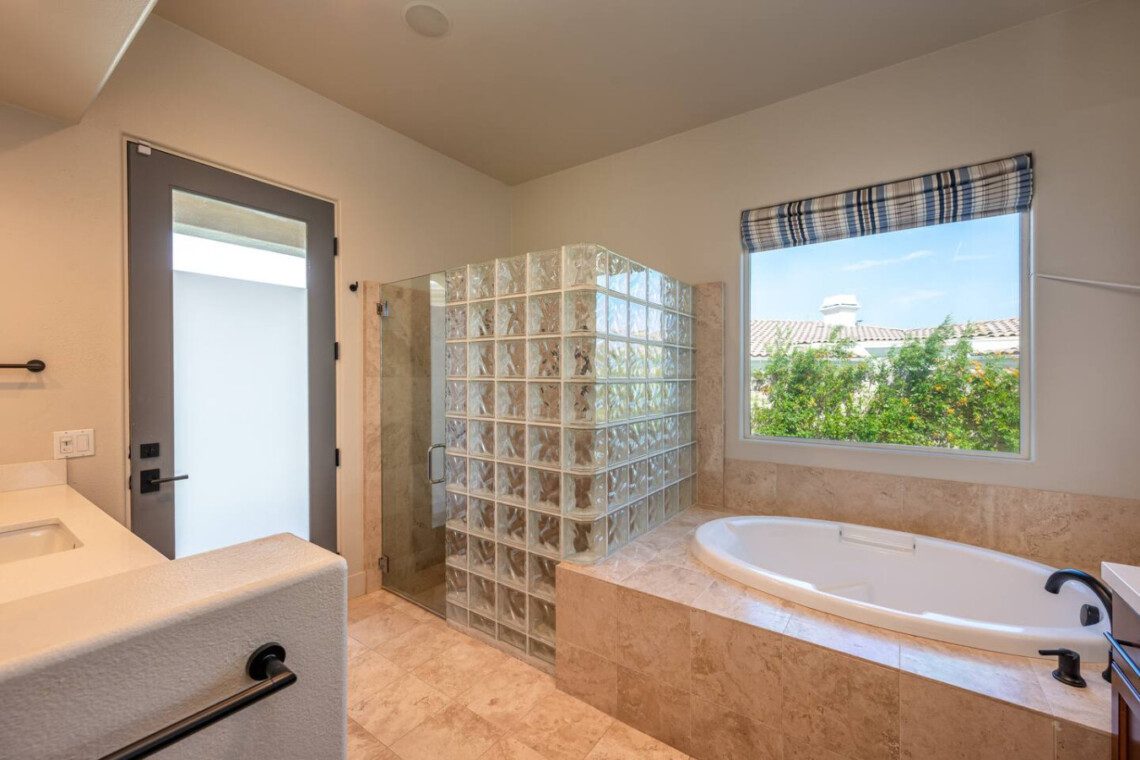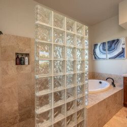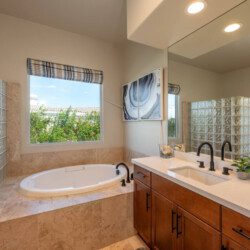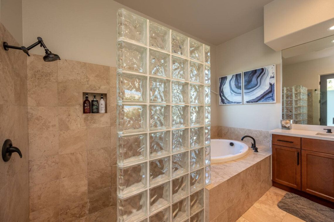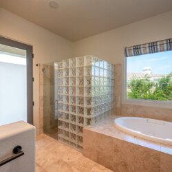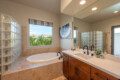 —Bathroom #1: separate standing shower and tub, dual vanity, shampoo/conditioner/body soap, towels