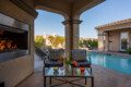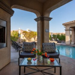 ●Covered Patio: Conversation seating around gas fireplace, 8-person dining table and chairs