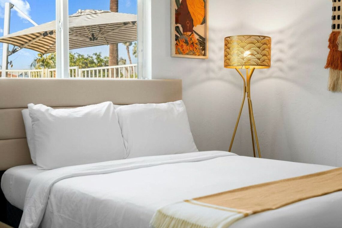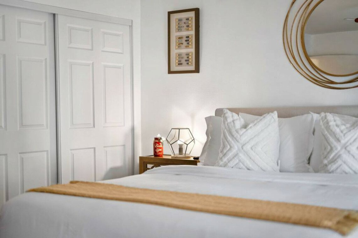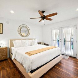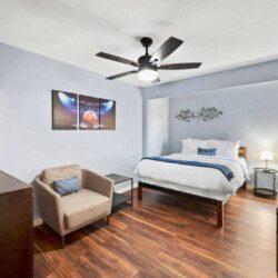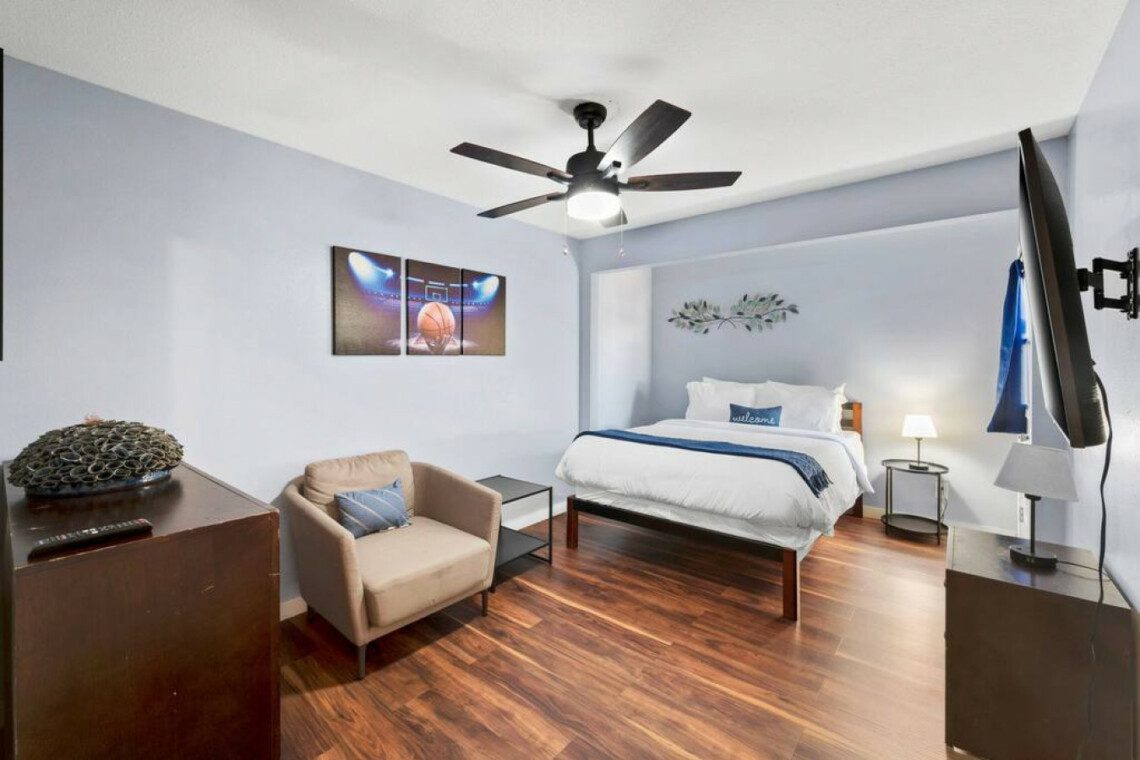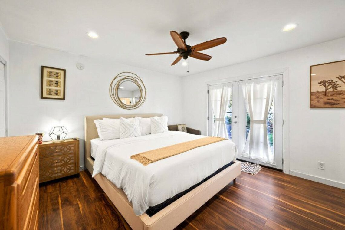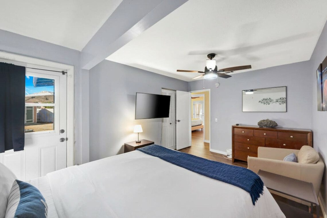 ●Bedroom #1 (primary): King bed with ensuite bath, nightstand, table lamp, accent chair, dresser, smart TV, access to backyard, closet, luggage rack, ceiling fan