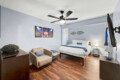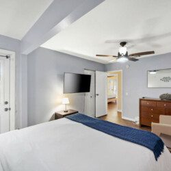 ●Bedroom #2 (secondary): Queen bed with ensuite bath, nightstand, table lamp, dresser, smart TV, ceiling fan, closet, luggage rack