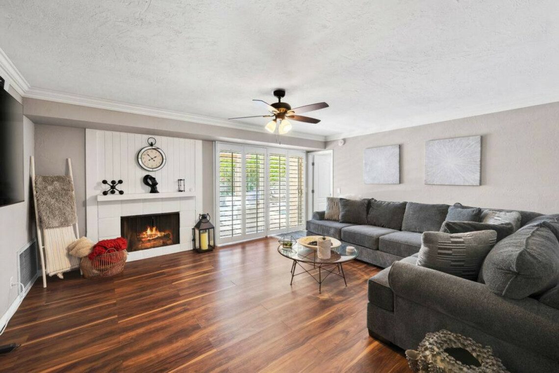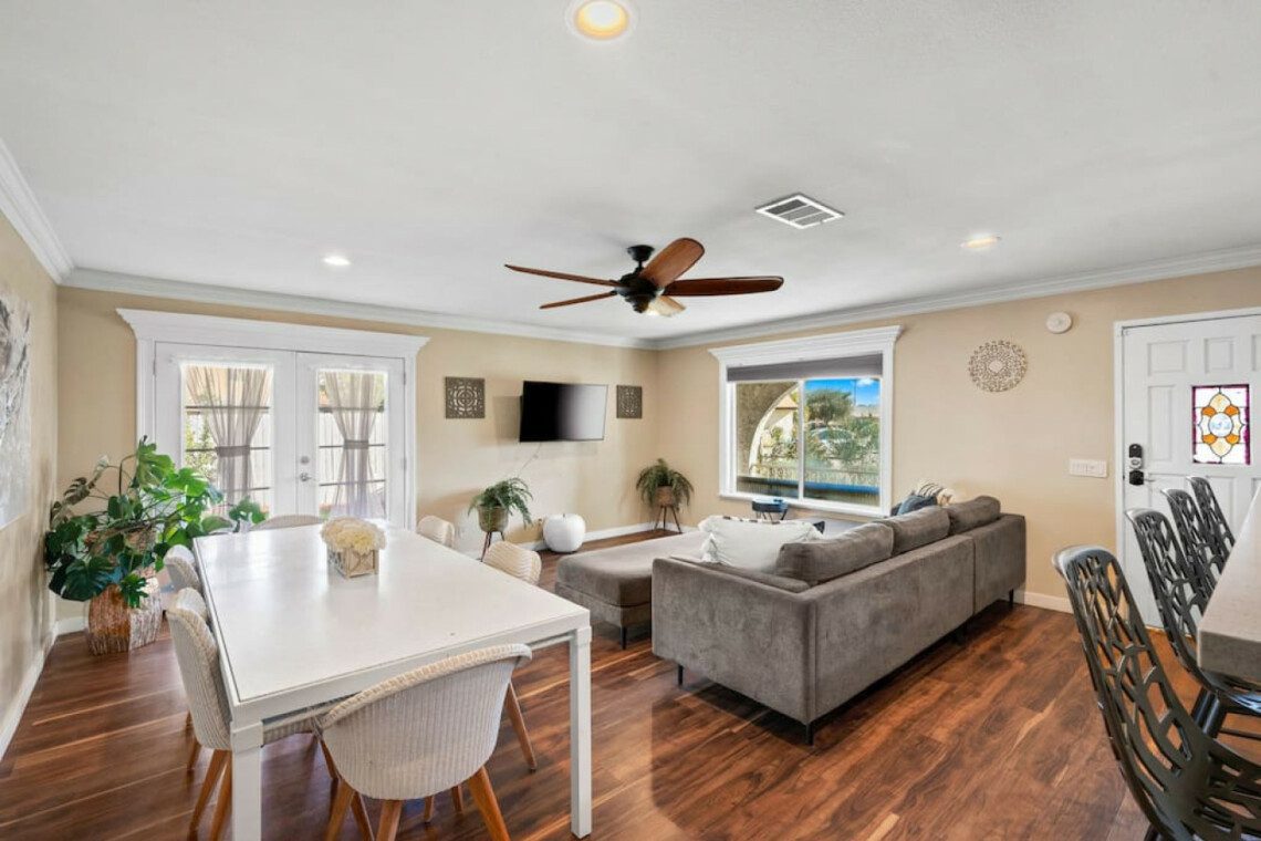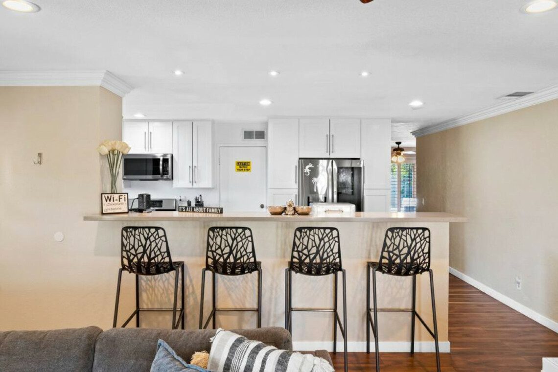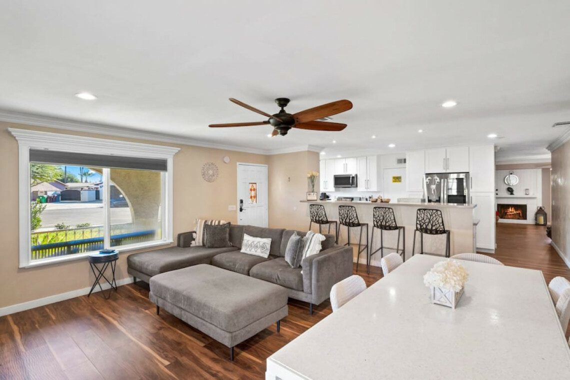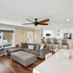 This quaint 4 bedroom/3 bathroom home is located in the corner of a quiet cul-de-sac. The home boasts an open concept that connects the recently renovated kitchen, living room, and dining space. The newly renovated kitchen has stainless steel appliances and is fully stocked with all the necessary cooking pots and utensils to make you feel like you’re in the comforts of your own home. There is an additional common area featuring a large sectional, smart TV, fireplace, and a stand alone bar. There is a king bed in the master bedroom and ensuite bath with french doors leading out into the side patio. The remaining 3 bedrooms have queen beds and share 2 full baths. Additionally, the sectional in the family room can be pulled out into a queen bed to sleep 2 more guests.