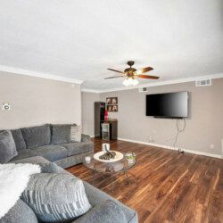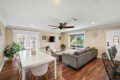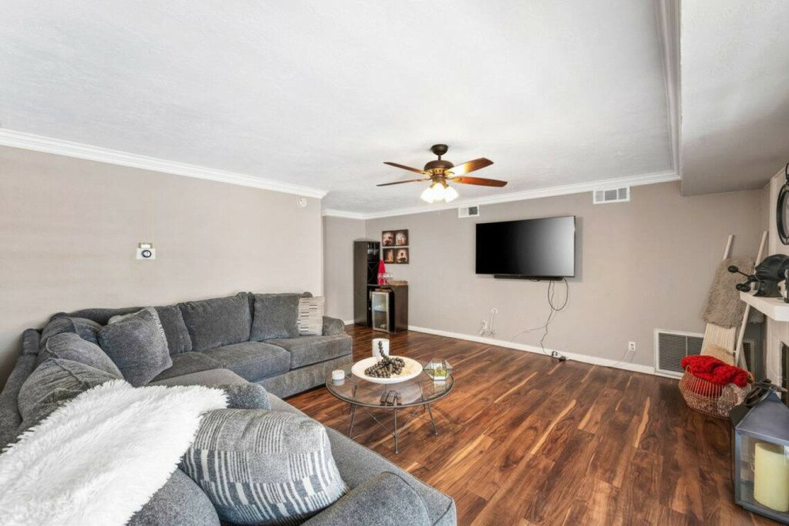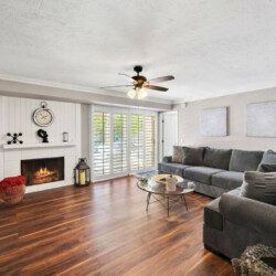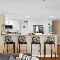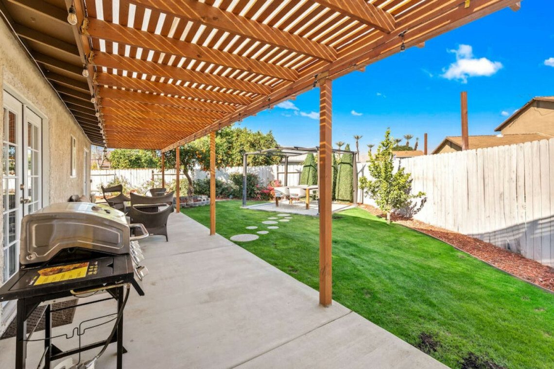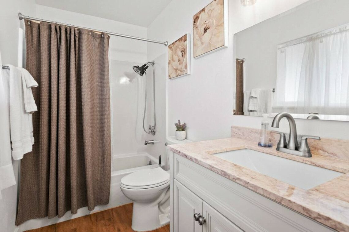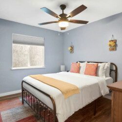 This quaint 4 bedroom/3 bathroom home is located in the corner of a quiet cul-de-sac. The home boasts an open concept that connects the recently renovated kitchen, living room, and dining space. The newly renovated kitchen has stainless steel appliances and is fully stocked with all the necessary cooking pots and utensils to make you feel like you’re in the comforts of your own home. There is an additional common area featuring a large sectional, smart TV, fireplace, and a stand alone bar. There is a king bed in the master bedroom and ensuite bath with french doors leading out into the side patio. The remaining 3 bedrooms have queen beds and share 2 full baths. Additionally, the sectional in the family room can be pulled out into a queen bed to sleep 2 more guests.