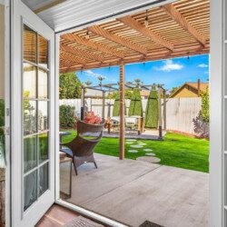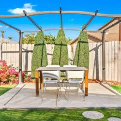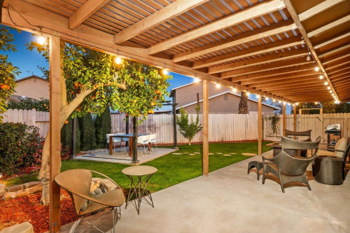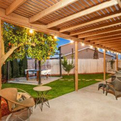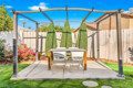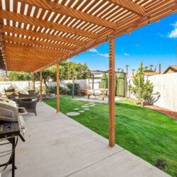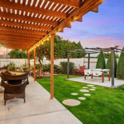 ●Backyard Area #3: Covered patio with propane 4-burner grill, seating area with propane fire-pit, and additional 4-person table for al fresco dining surrounded by citrus trees