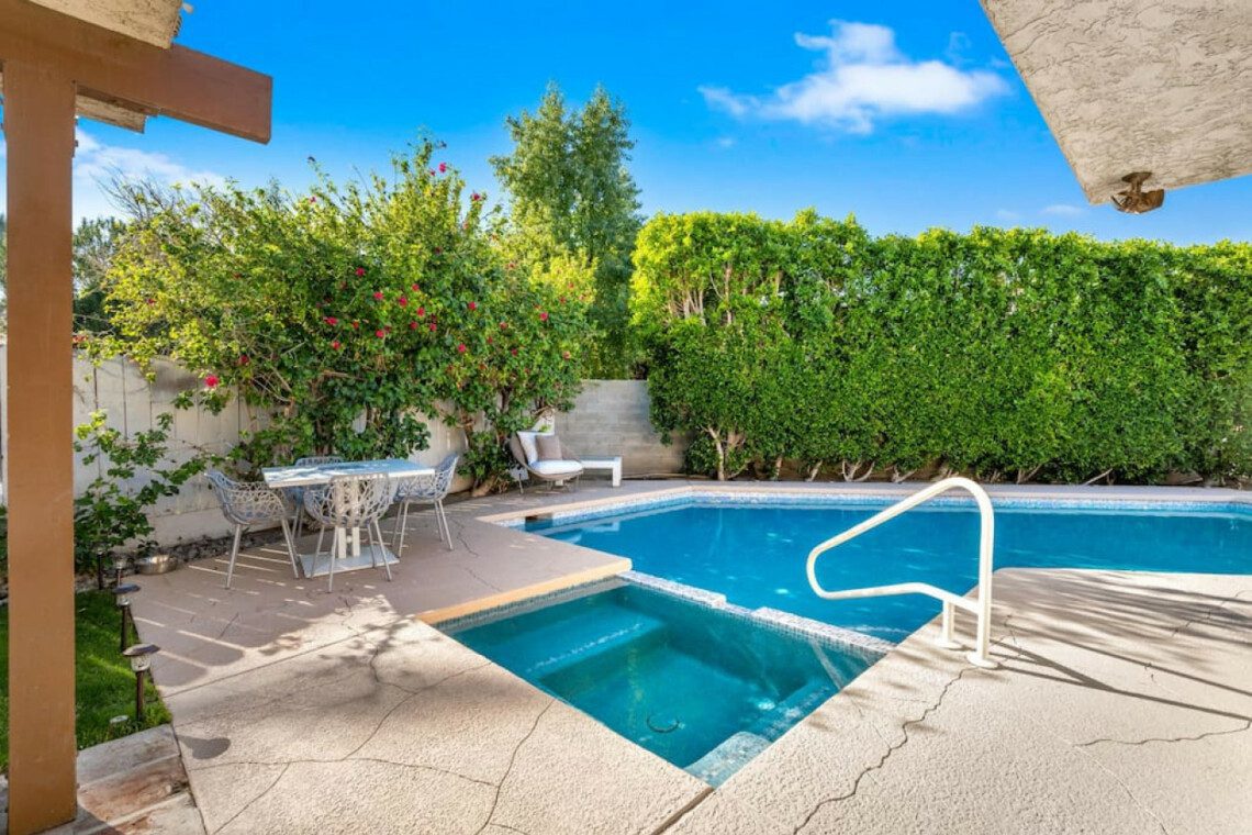 ●Backyard Area #1: Gated pool and spa with smart automation and easy spa control (pool heating: $75/day, spa heating: $25/day), covered patio with conversation sectional seating and smart tv