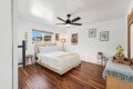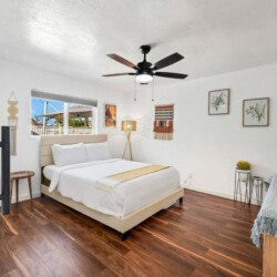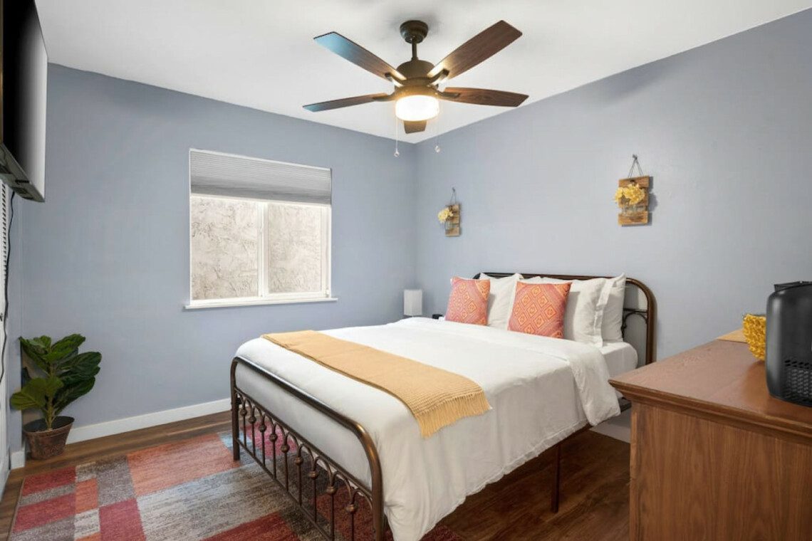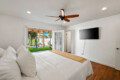 ●Bedroom #3: Queen bed, nightstand, table lamp, dresser, accent chair, ceiling fan, closet, luggage rack, access to backyard