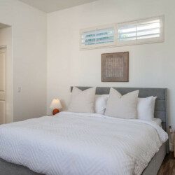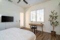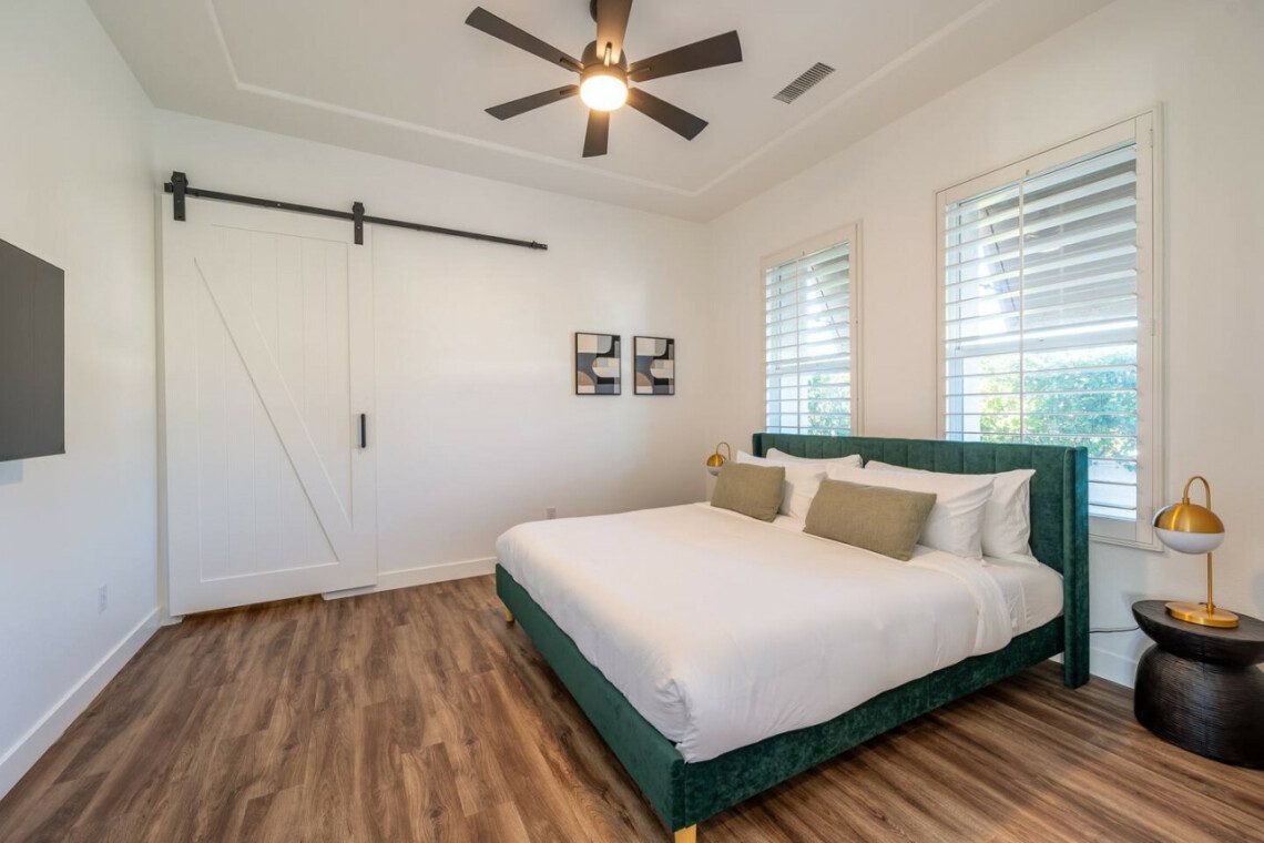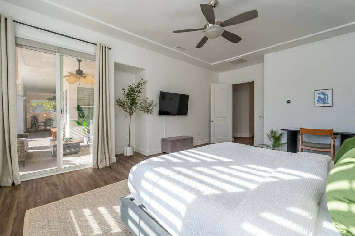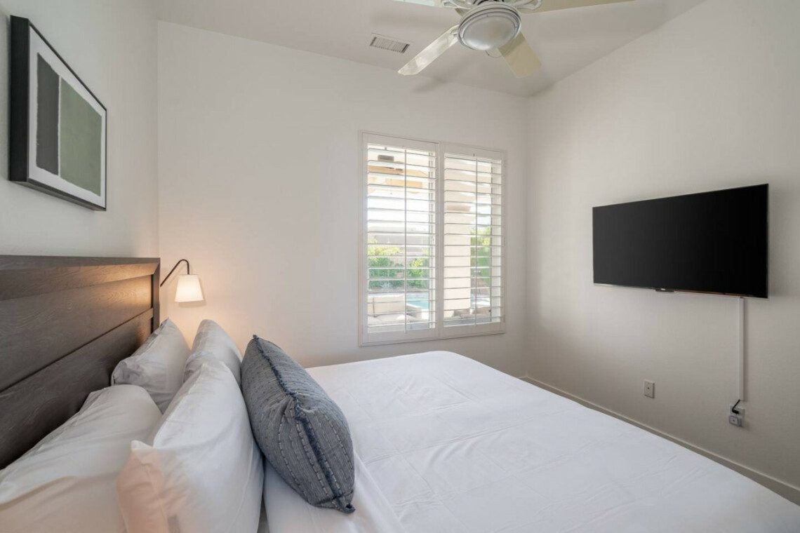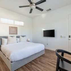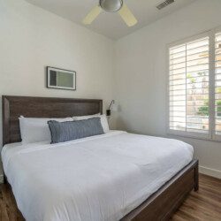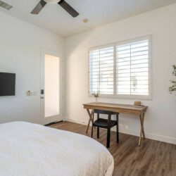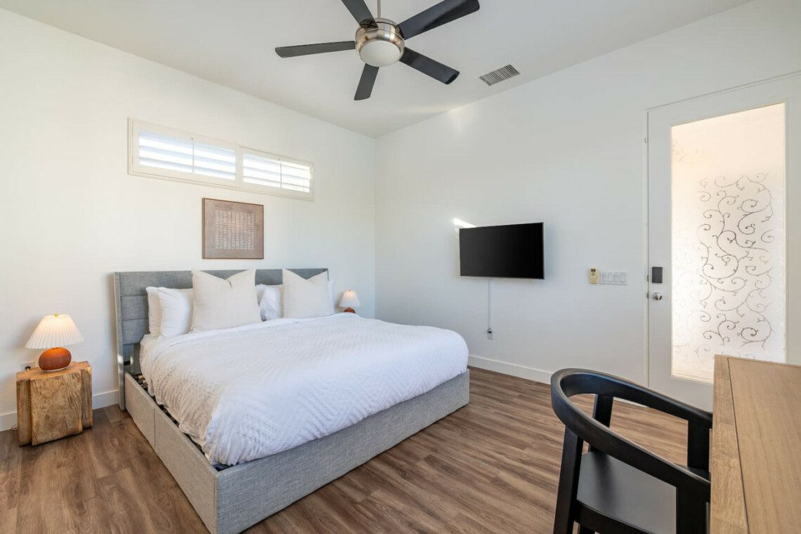 ●Bedroom #2 (secondary/casita): King bed, ensuite bath, 42″ smart tv, side tables, table lamps, designated workspace, ceiling fan, closet, luggage rack, separate entrance