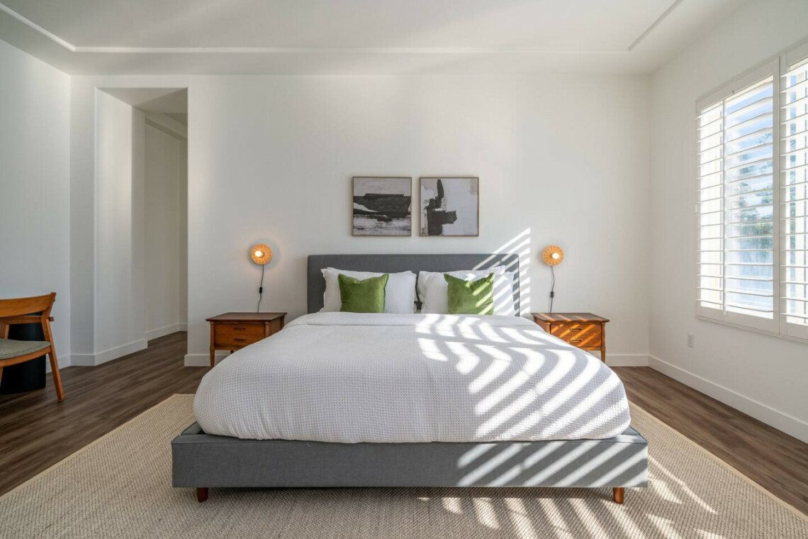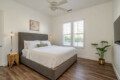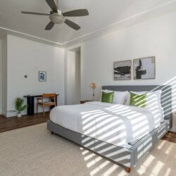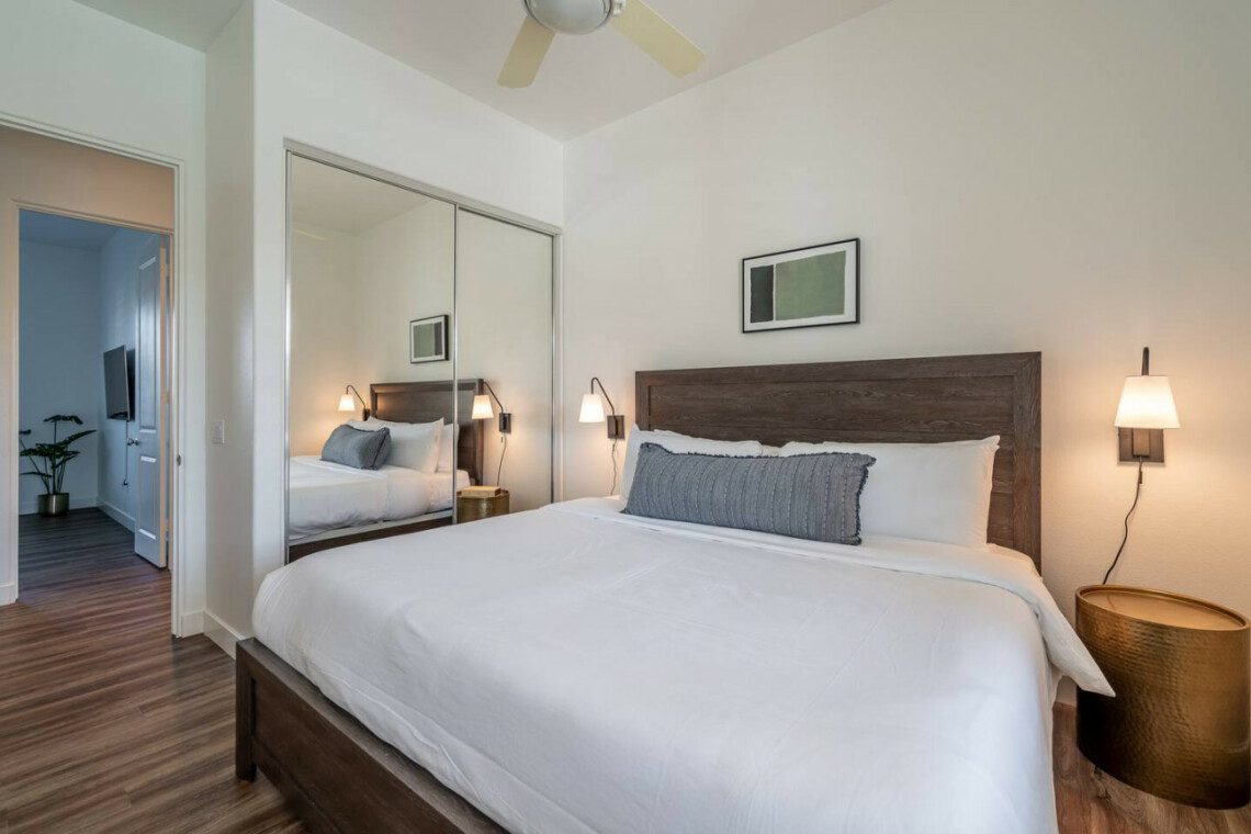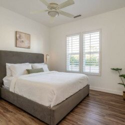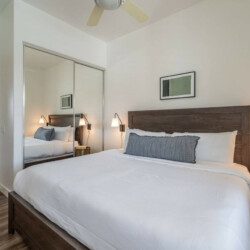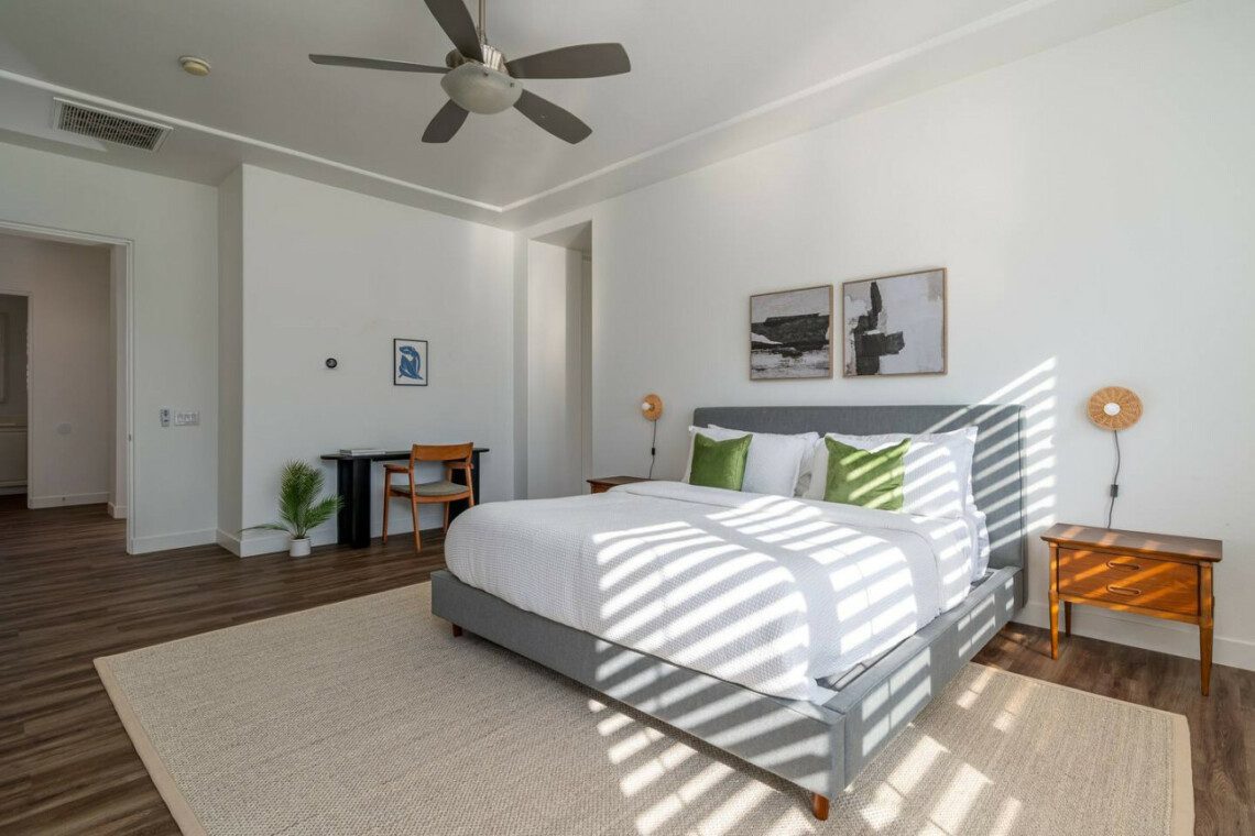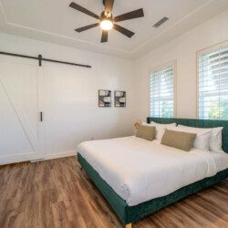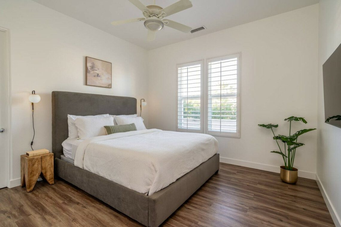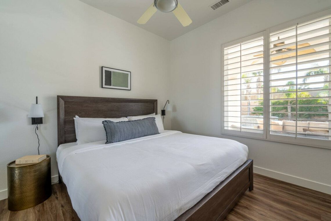 ●Bedroom #2 (secondary/casita): King bed, ensuite bath, 42″ smart tv, side tables, table lamps, designated workspace, ceiling fan, closet, luggage rack, separate entrance