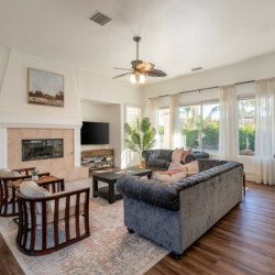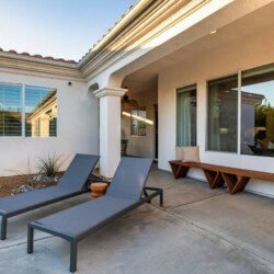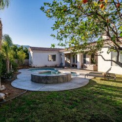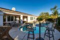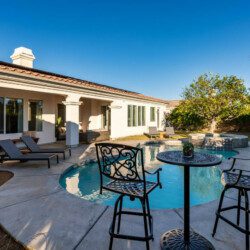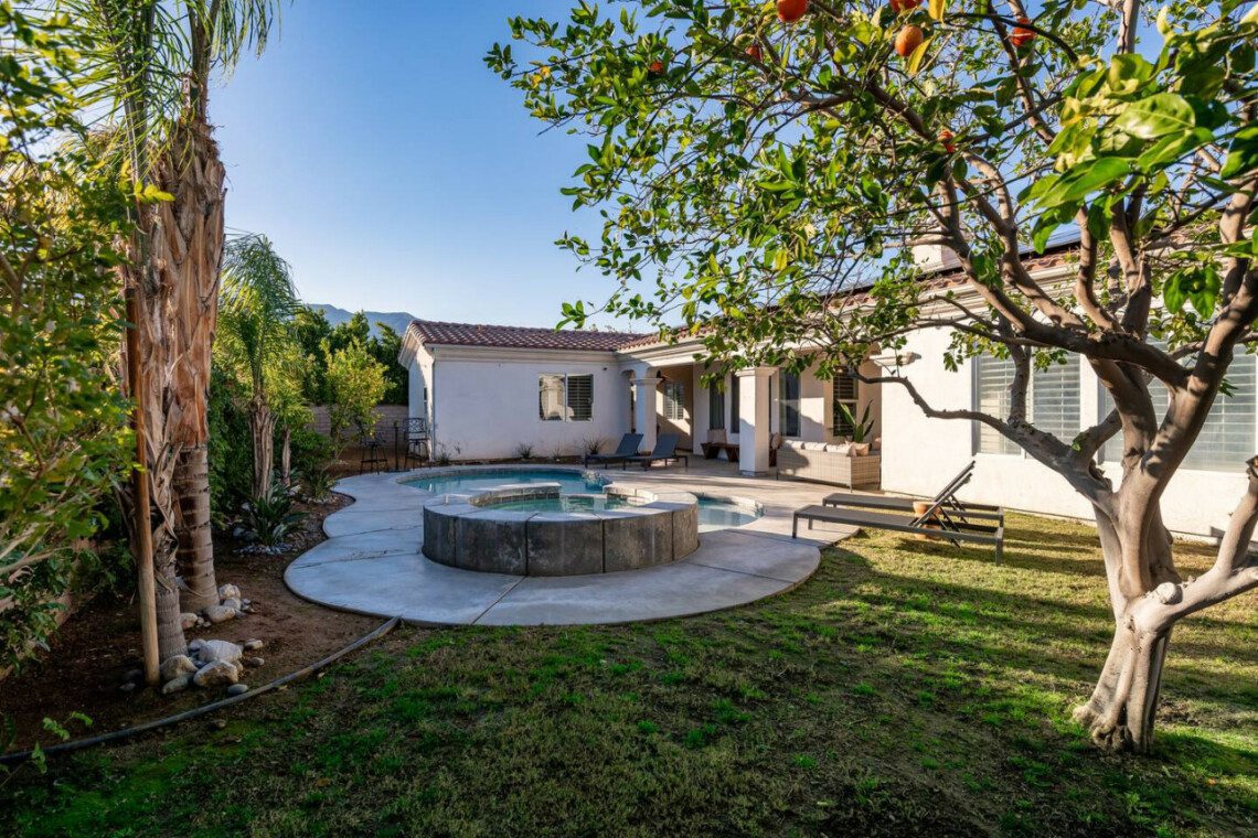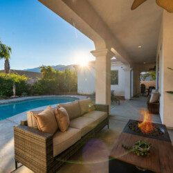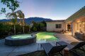 Venture into the backyard oasis where the allure continues. Enjoy the picturesque mountain views while basking in the private pool and spa. Sun lounges beckon for lazy afternoons, and a conversation seating area centered around a fire pit table creates a cozy ambiance for evening gatherings. For al fresco dining, there’s a charming dining table under the covered patio. Whether you’re seeking tranquility by the pool or the warmth of a fire-lit conversation, this retreat promises a perfect blend of indoor luxury and outdoor bliss.