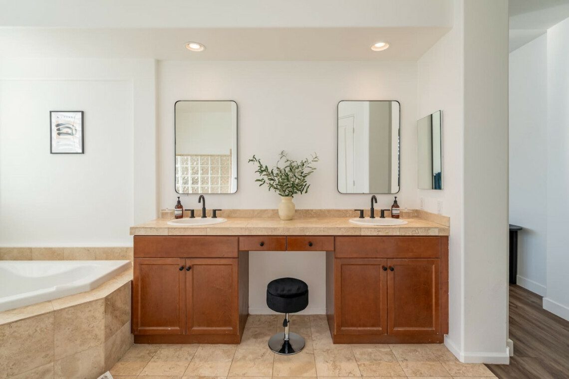 ●Bedroom #1 (primary): King bed, ensuite bath with tub and standing shower, 55″ smart tv, night stands, sconces, designated workspace, closet, luggage rack, ceiling fan, access to backyard