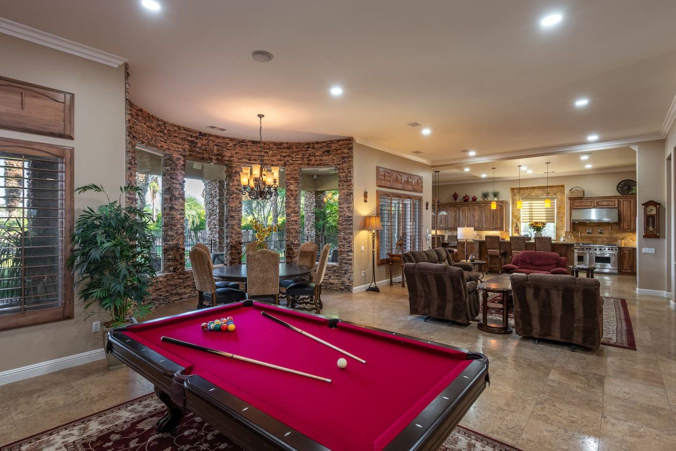 Inside, this spacious home features five bedrooms and four-and-a-half bathrooms, designed for comfort and connection. The fully equipped kitchen makes entertaining effortless, while the cozy main living room opens to a bar and billiards area, perfect for evening fun. An additional family room with plush seating and a large TV offers even more space to unwind after a day in the sun — making Sienna Estate the ultimate getaway for families and groups seeking relaxation and togetherness in timeless desert style.