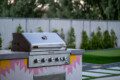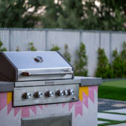 ●Covered Pergola: Natural gas stainless steel grill and island, 6-person table for al fresco dining, ceiling fan