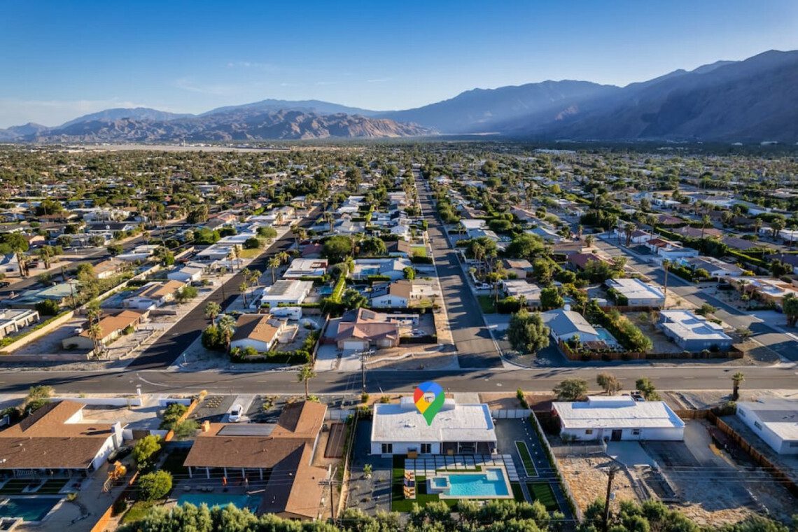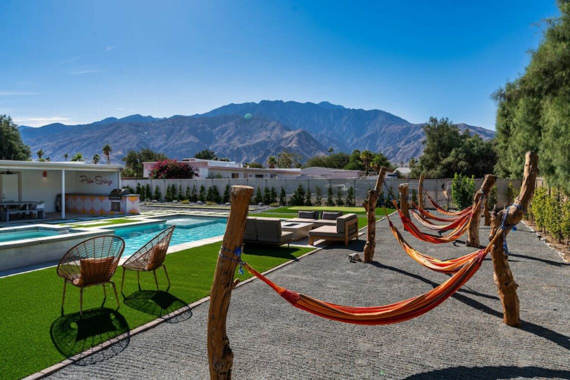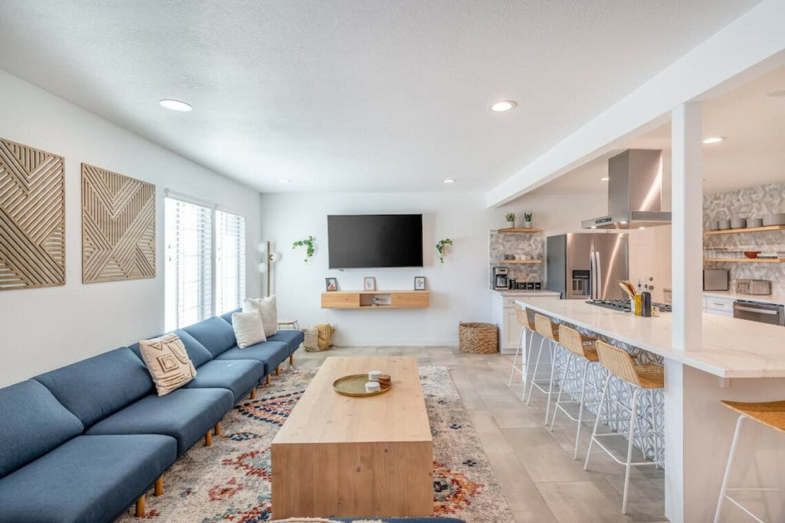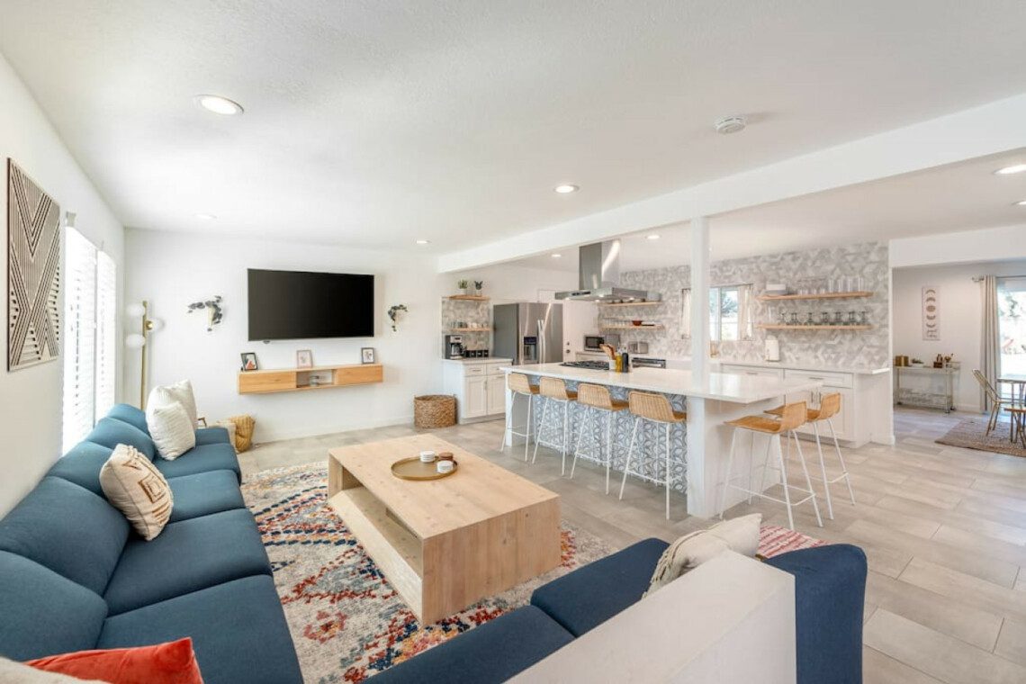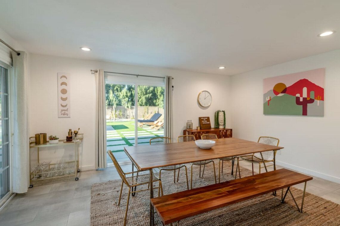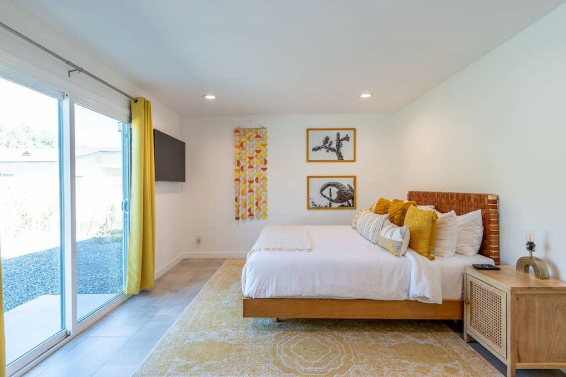 Nestled in the heart of desert paradise that is Palm Springs, Sunny Vista offers an unforgettable retreat where boho charm meets modern luxury. This 4-bedroom, 2-bathroom villa is a true gem, boasting an open-concept kitchen and living space that beckons guests to gather and savor the beauty of the desert landscape. Picture windows frame the stunning mountain views, allowing you to soak in the natural beauty of Palm Springs as you unwind in the cozy living room. The fully equipped kitchen is a chef’s dream, encouraging culinary creativity as you prepare delicious meals. With ample counter space and modern appliances, it’s the perfect hub for preparing a poolside feast or hosting a family dinner.