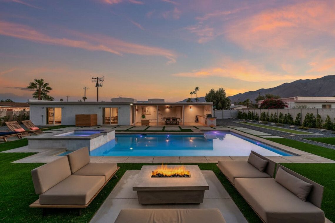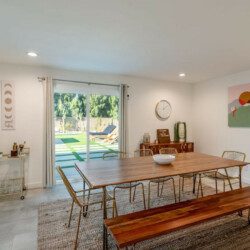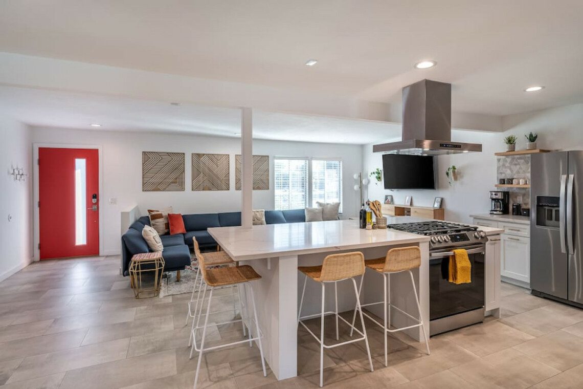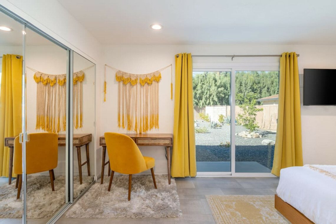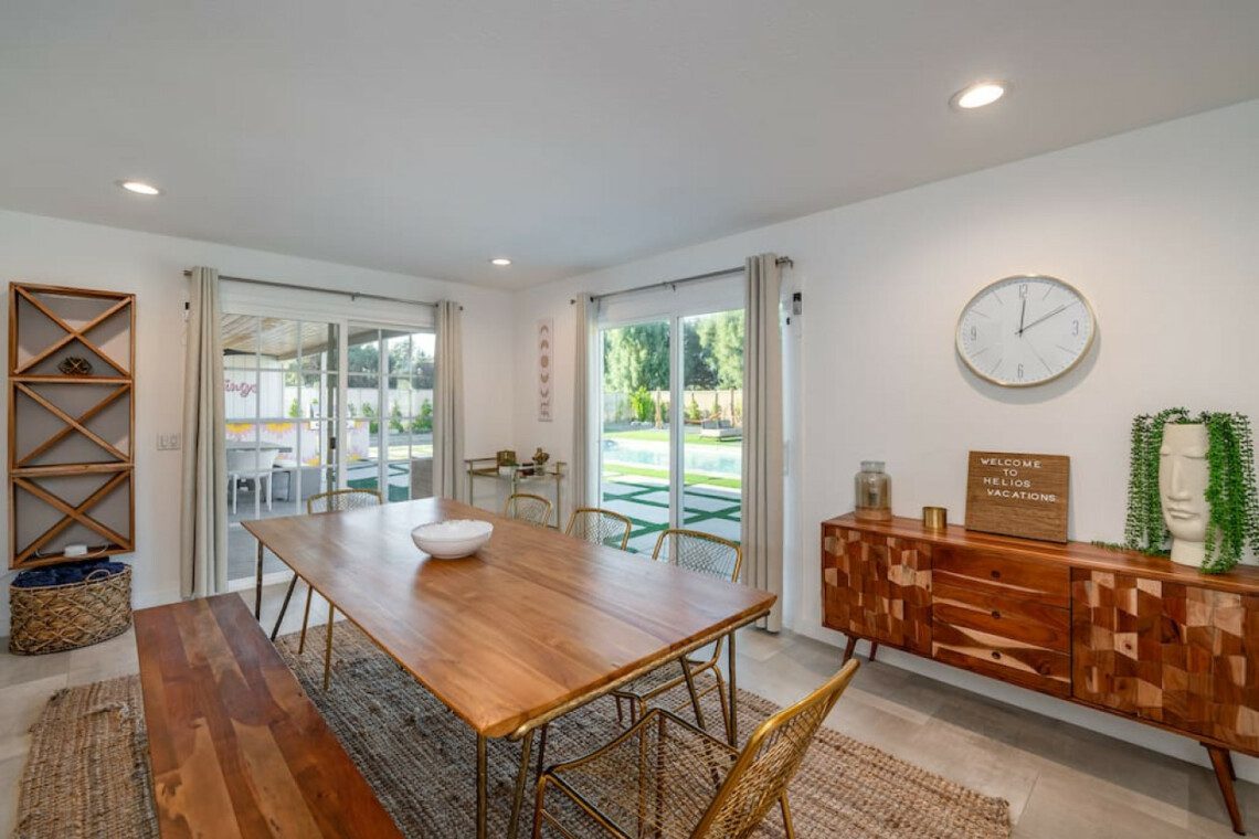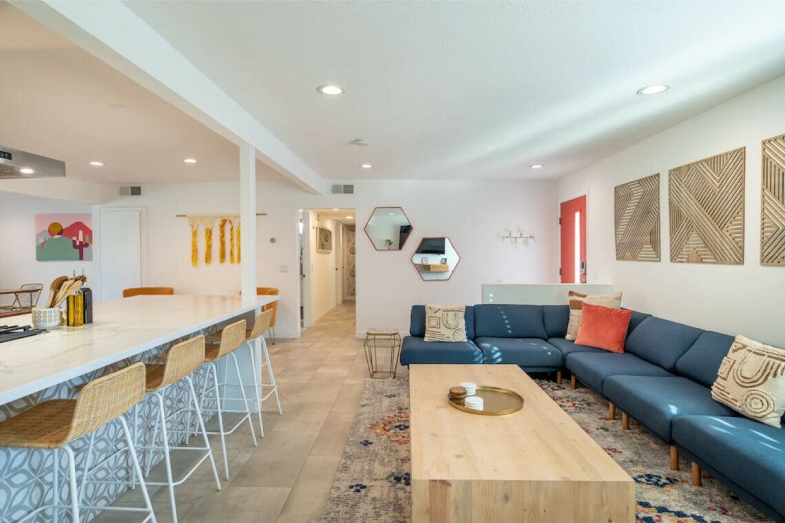 Nestled in the heart of desert paradise that is Palm Springs, Sunny Vista offers an unforgettable retreat where boho charm meets modern luxury. This 4-bedroom, 2-bathroom villa is a true gem, boasting an open-concept kitchen and living space that beckons guests to gather and savor the beauty of the desert landscape. Picture windows frame the stunning mountain views, allowing you to soak in the natural beauty of Palm Springs as you unwind in the cozy living room. The fully equipped kitchen is a chef’s dream, encouraging culinary creativity as you prepare delicious meals. With ample counter space and modern appliances, it’s the perfect hub for preparing a poolside feast or hosting a family dinner.