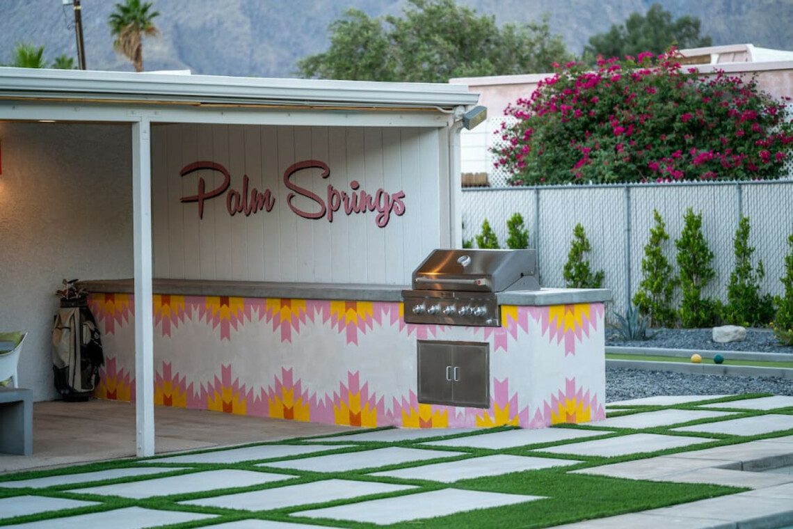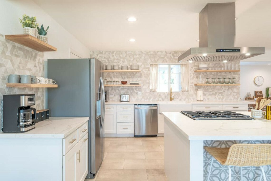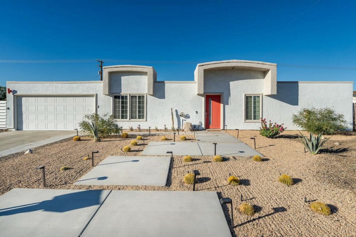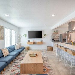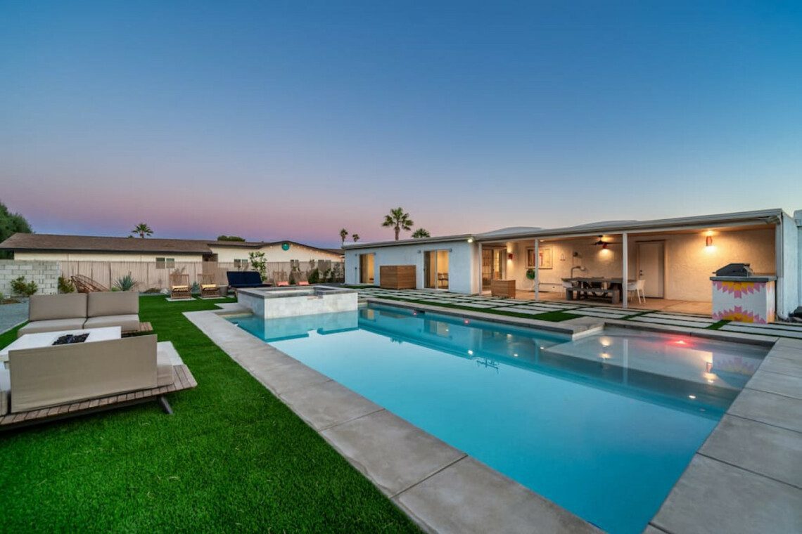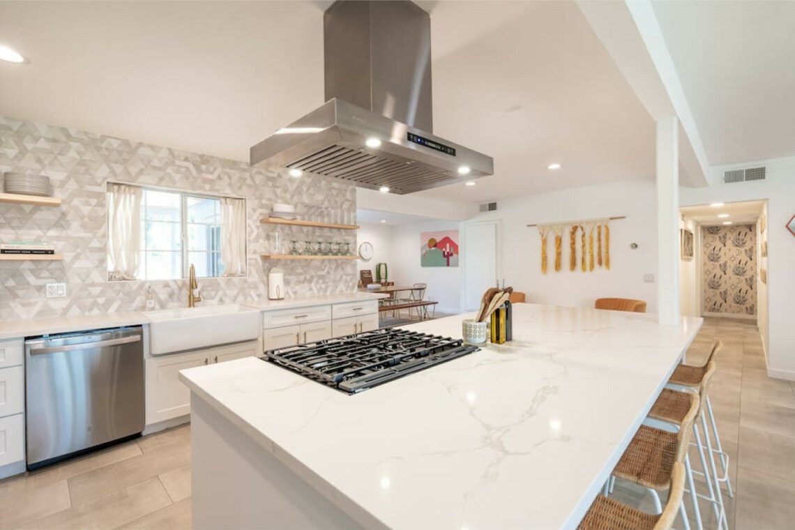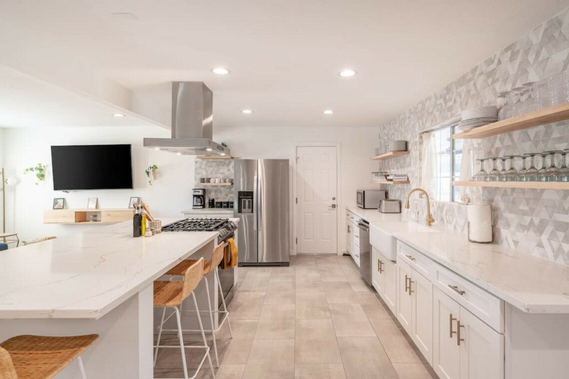 Nestled in the heart of desert paradise that is Palm Springs, Sunny Vista offers an unforgettable retreat where boho charm meets modern luxury. This 4-bedroom, 2-bathroom villa is a true gem, boasting an open-concept kitchen and living space that beckons guests to gather and savor the beauty of the desert landscape. Picture windows frame the stunning mountain views, allowing you to soak in the natural beauty of Palm Springs as you unwind in the cozy living room. The fully equipped kitchen is a chef’s dream, encouraging culinary creativity as you prepare delicious meals. With ample counter space and modern appliances, it’s the perfect hub for preparing a poolside feast or hosting a family dinner.
