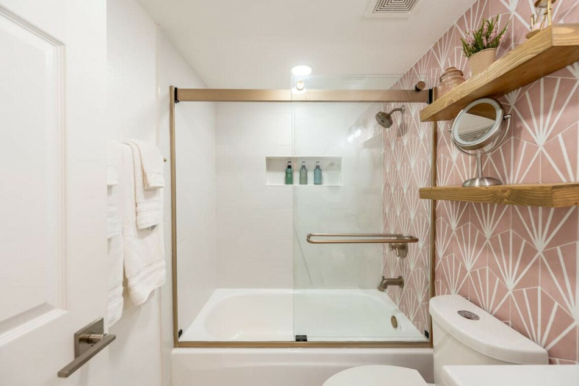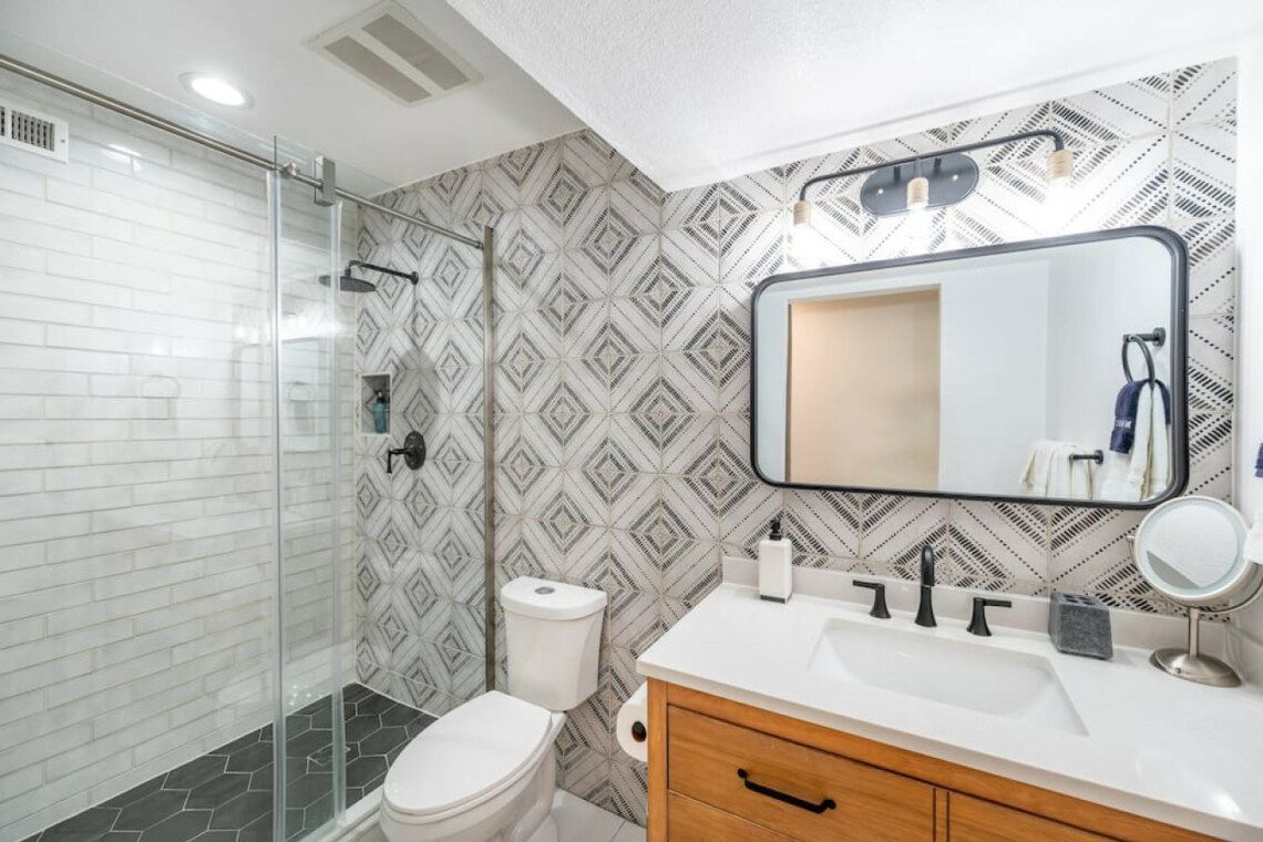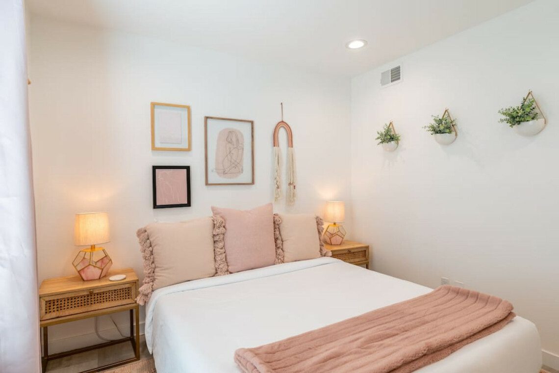 ●Bedroom #1 (primary): King bed, ensuite bath with full shower, smart tv, night stands, table lamps, designated workspace, closet, luggage rack, access to backyard