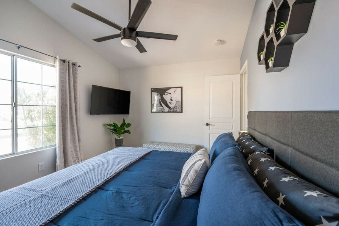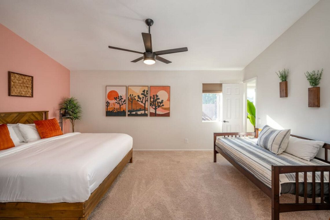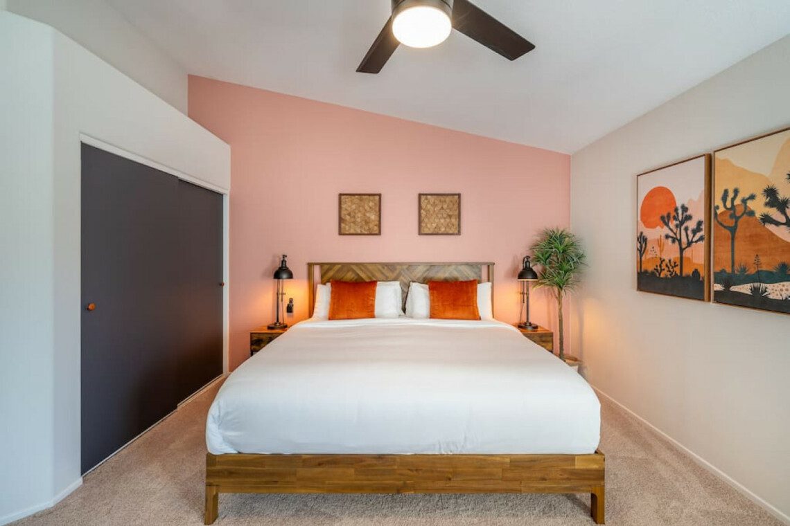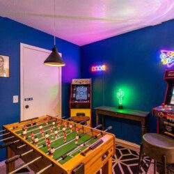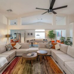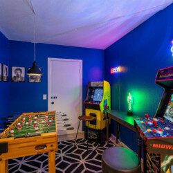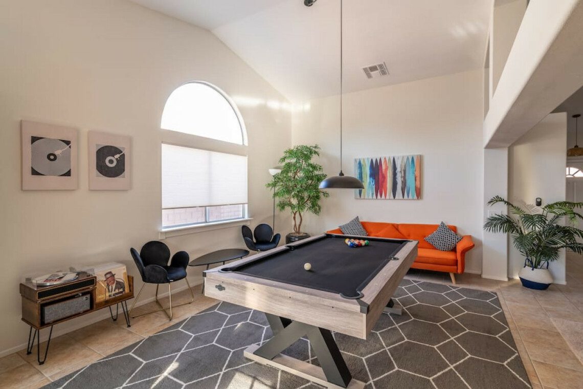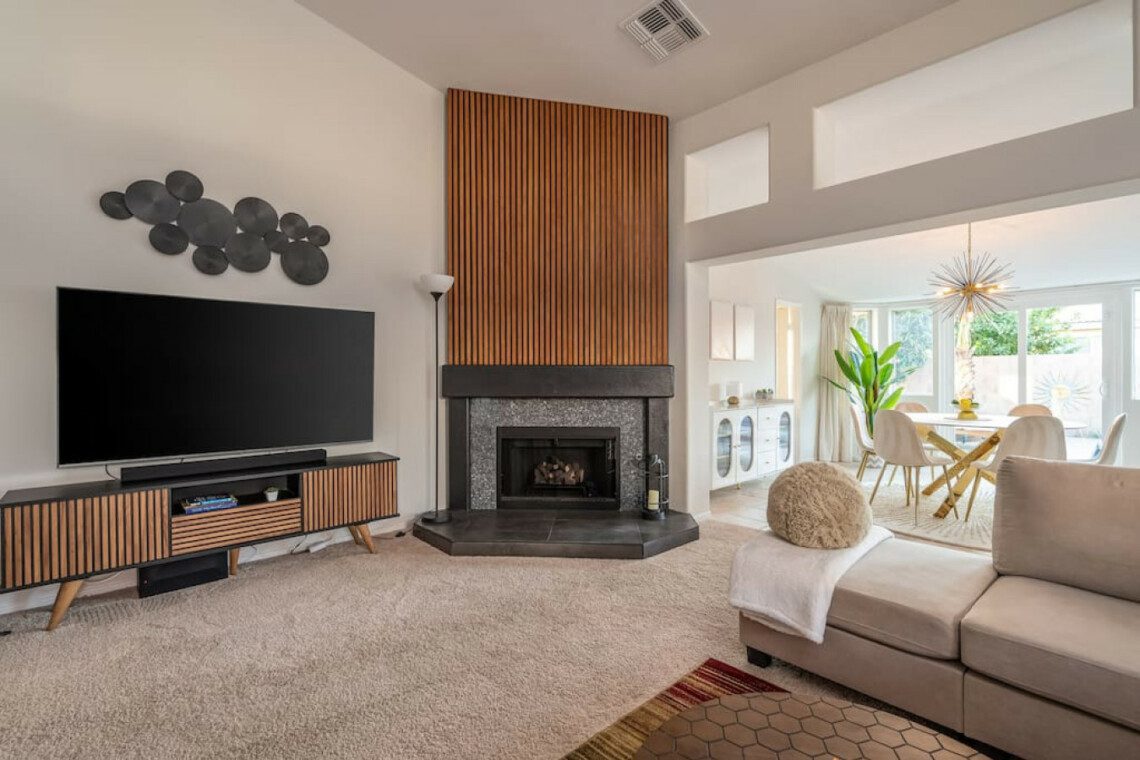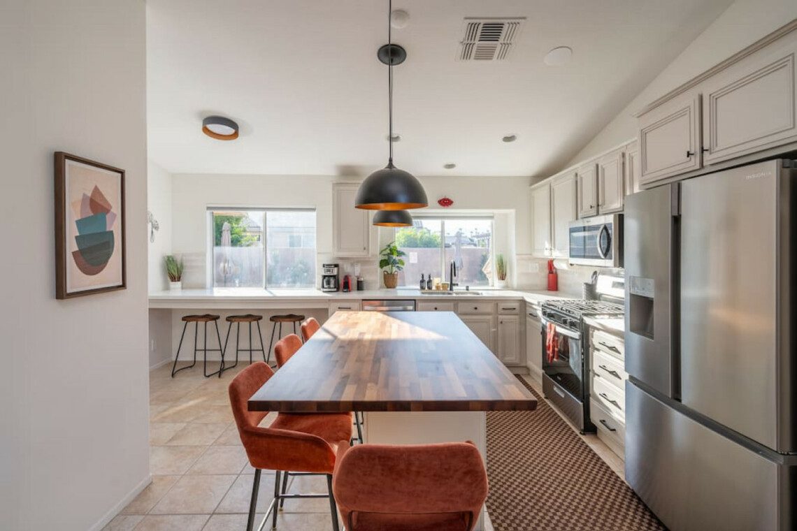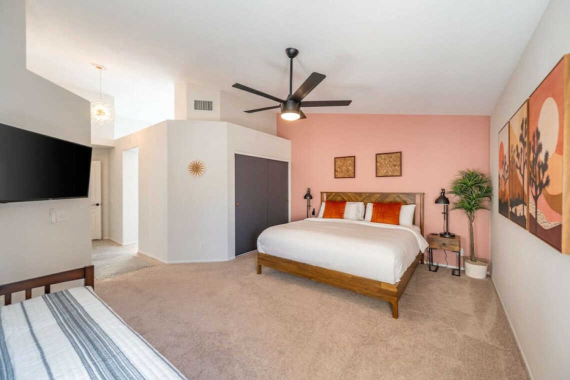 Step inside and you’ll be transported to a bygone era of bold, vivacious design. The interiors are adorned with vibrant colors, capturing the essence of mid-century style. The furniture, the wall art, and even the little details all harmonize to create an atmosphere of timelessness, offering a glimpse into a vibrant past that still resonates today. Each room is a testament to the era’s design philosophy, with furniture and decor that seamlessly blend together, inviting guests to experience a playful and colorful journey. Vintage record players grace the main room, inviting you to spin vinyl classics and set the mood with the sweet sounds of yesteryears. Whether it’s a groovy tune or a classic rock anthem, the musical vibes of this home infuse a sense of nostalgia and celebration into your stay.
