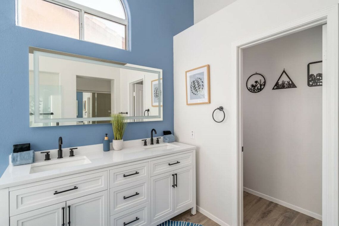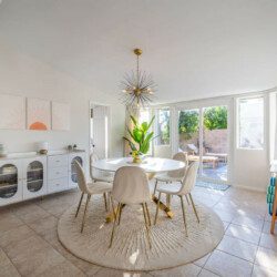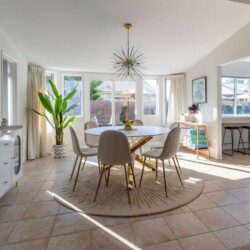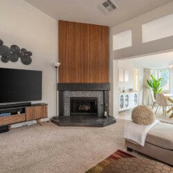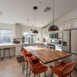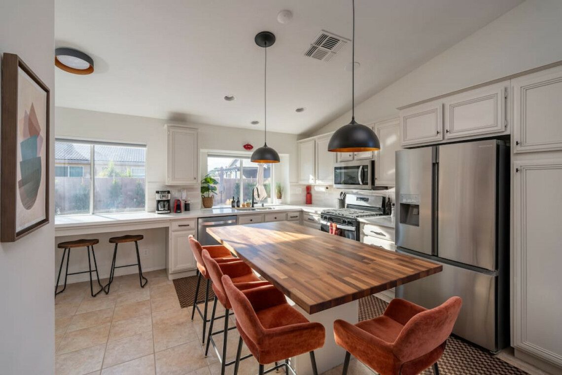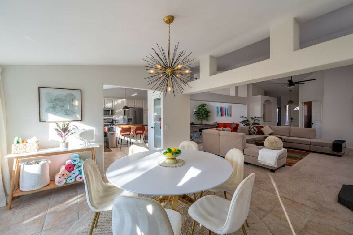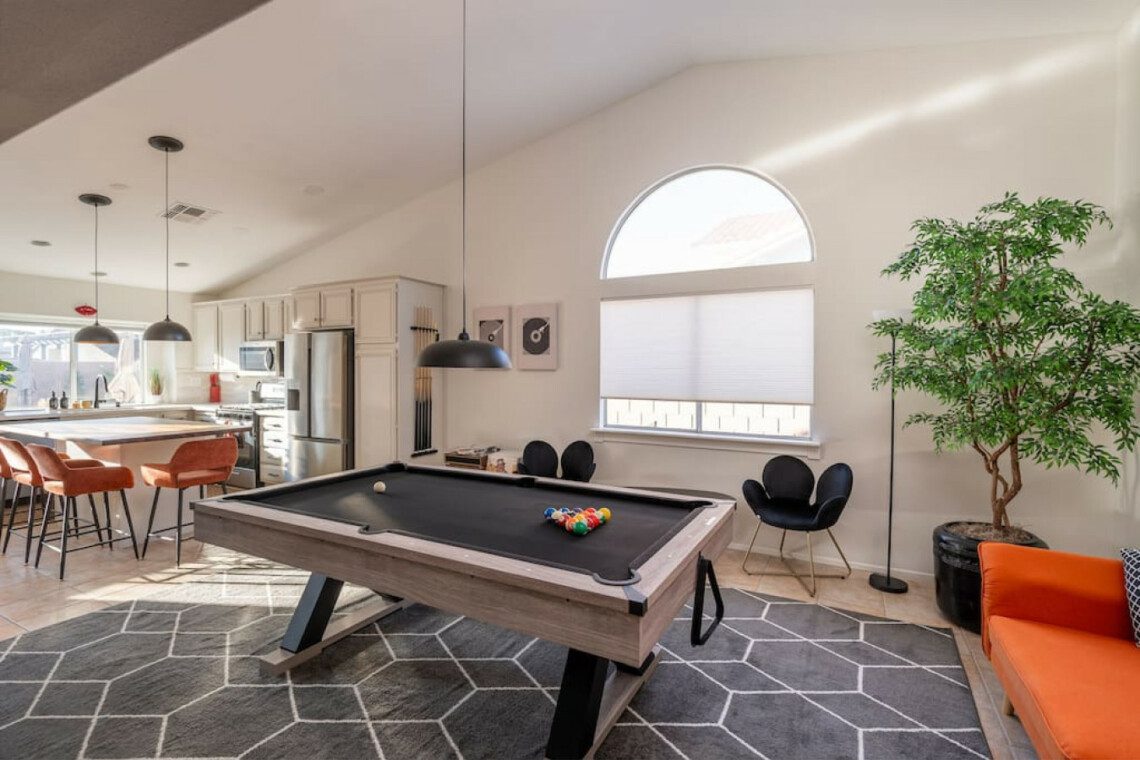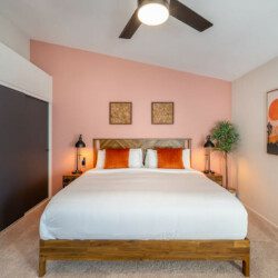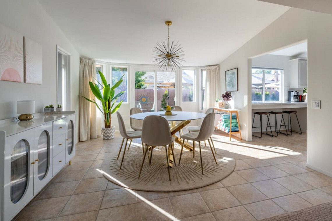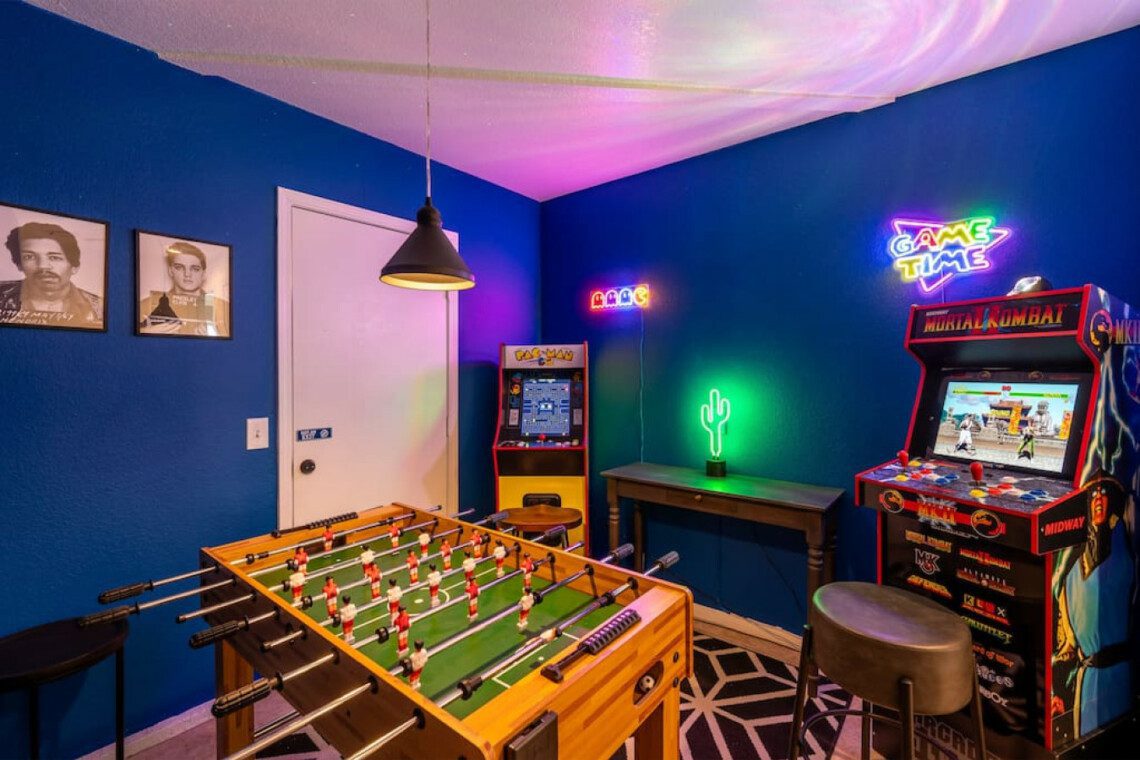 Step inside and you’ll be transported to a bygone era of bold, vivacious design. The interiors are adorned with vibrant colors, capturing the essence of mid-century style. The furniture, the wall art, and even the little details all harmonize to create an atmosphere of timelessness, offering a glimpse into a vibrant past that still resonates today. Each room is a testament to the era’s design philosophy, with furniture and decor that seamlessly blend together, inviting guests to experience a playful and colorful journey. Vintage record players grace the main room, inviting you to spin vinyl classics and set the mood with the sweet sounds of yesteryears. Whether it’s a groovy tune or a classic rock anthem, the musical vibes of this home infuse a sense of nostalgia and celebration into your stay.