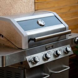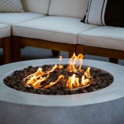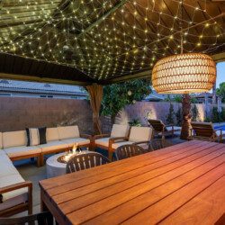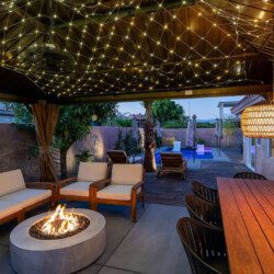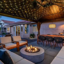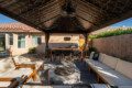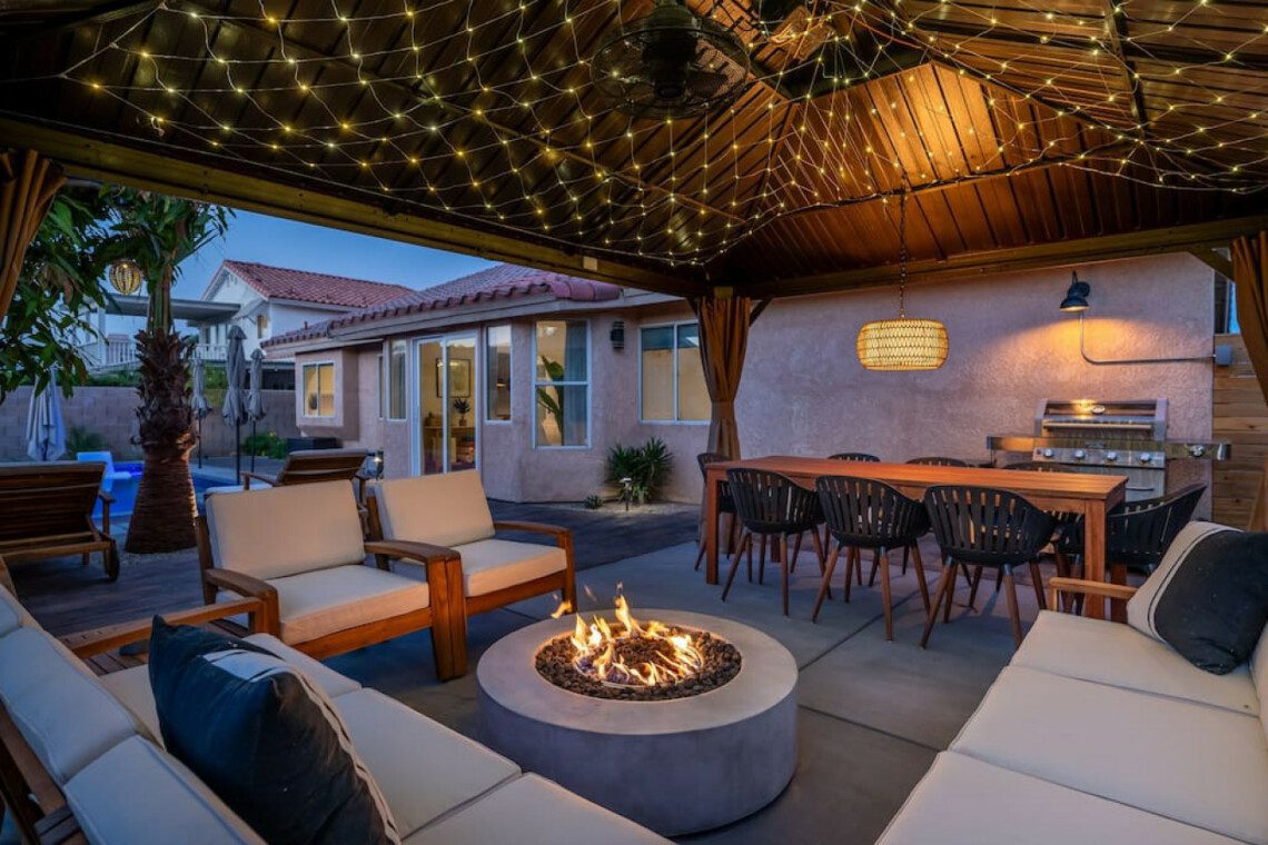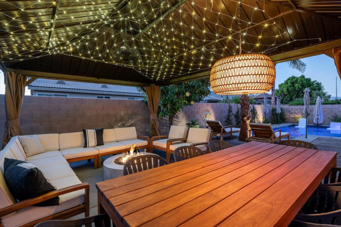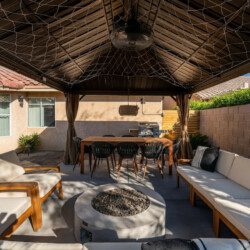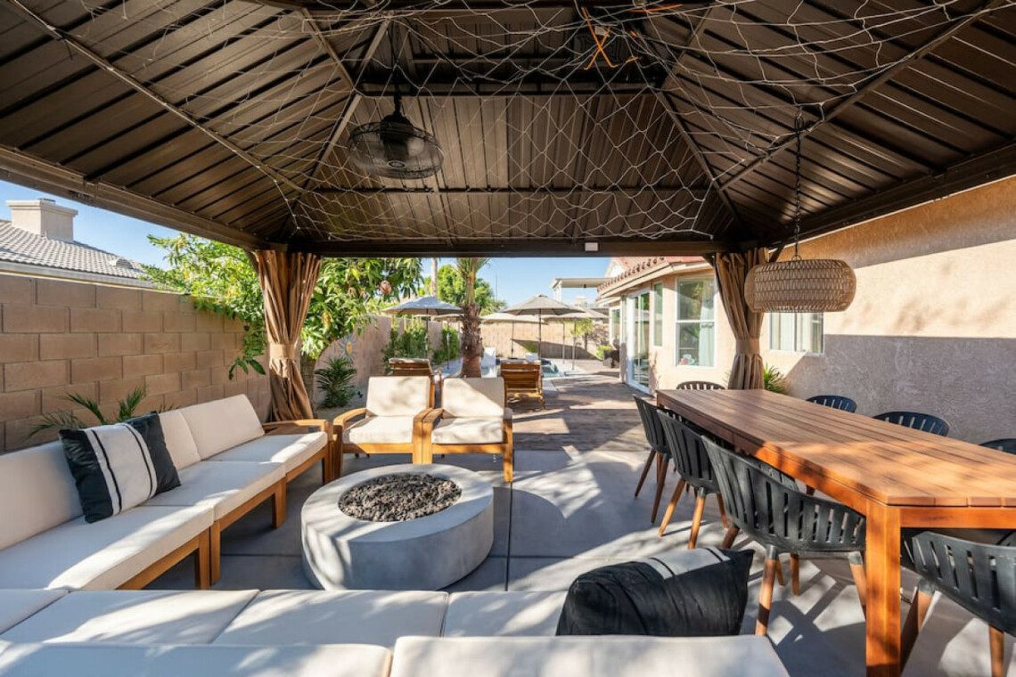 ●Covered Gazebo: Natural gas stainless steel grill, 8-person table for al fresco dining, large sectional seating with natural gas fire-pit