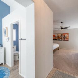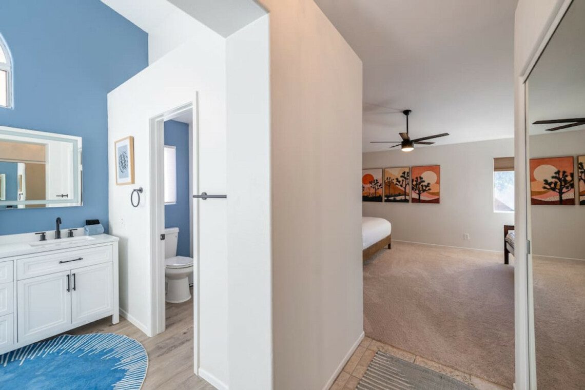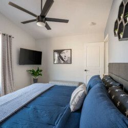 ●Bedroom #1 (primary): King bed & twin bed, ensuite bath, nightstands, table lamps, smart tv, ceiling fan, closet, luggage rack