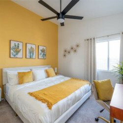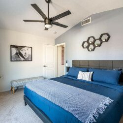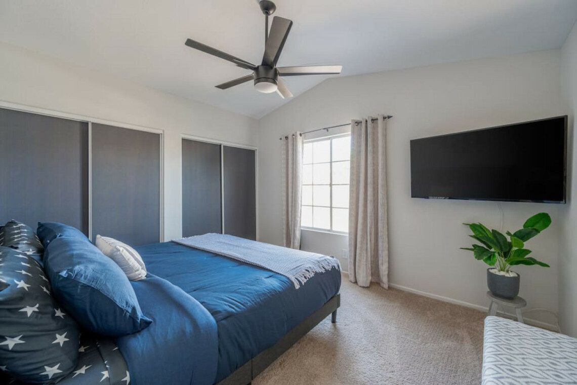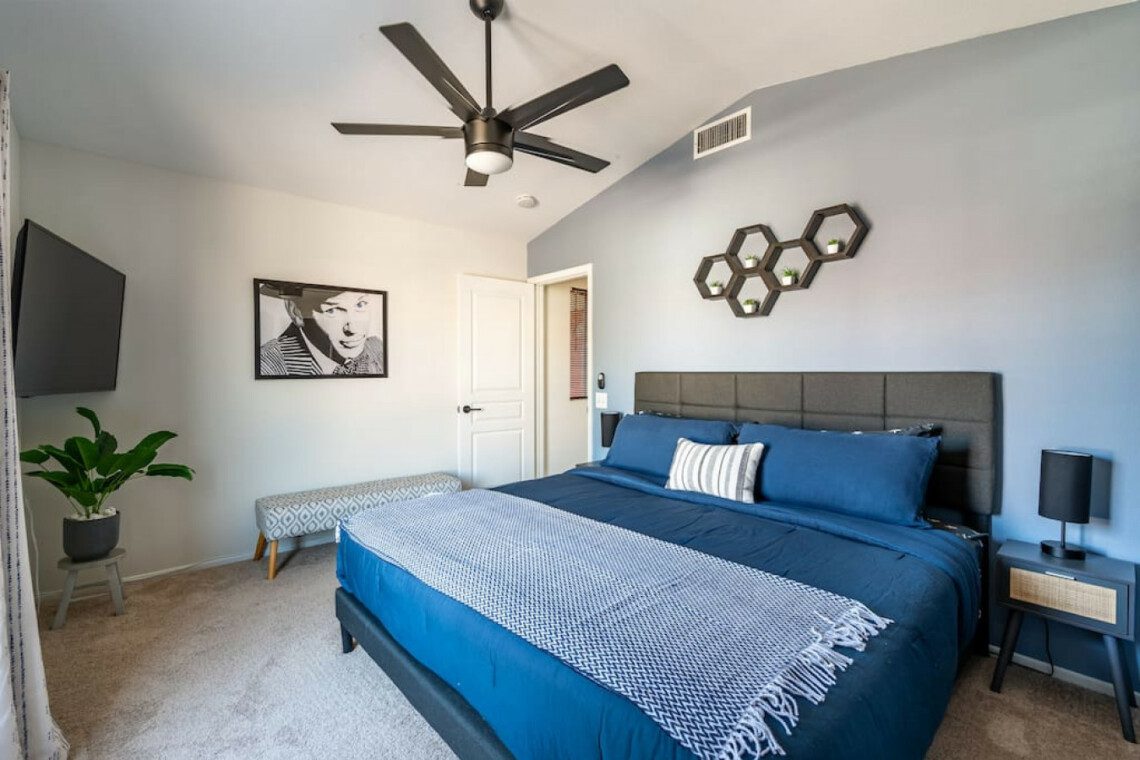 ●Bedroom #3: King bed, designated workspace, nightstands, table lamps, smart tv, ceiling fan, closet, luggage rack