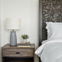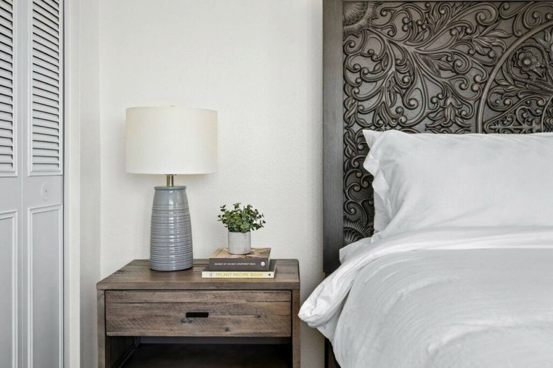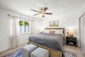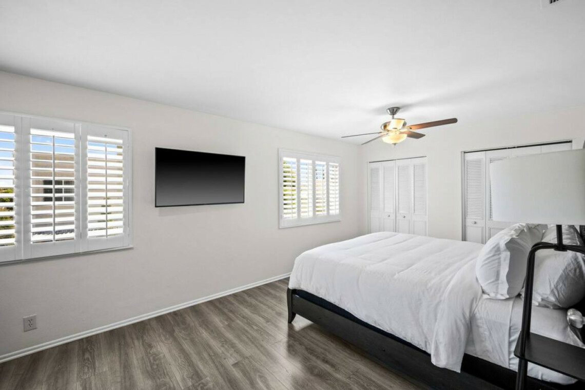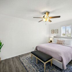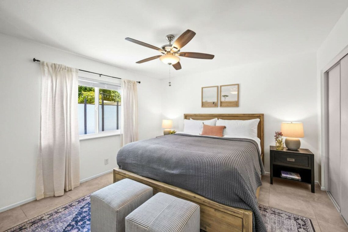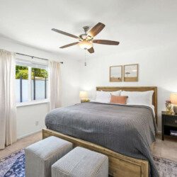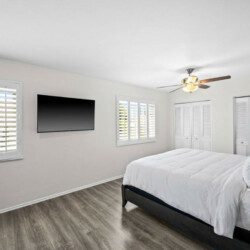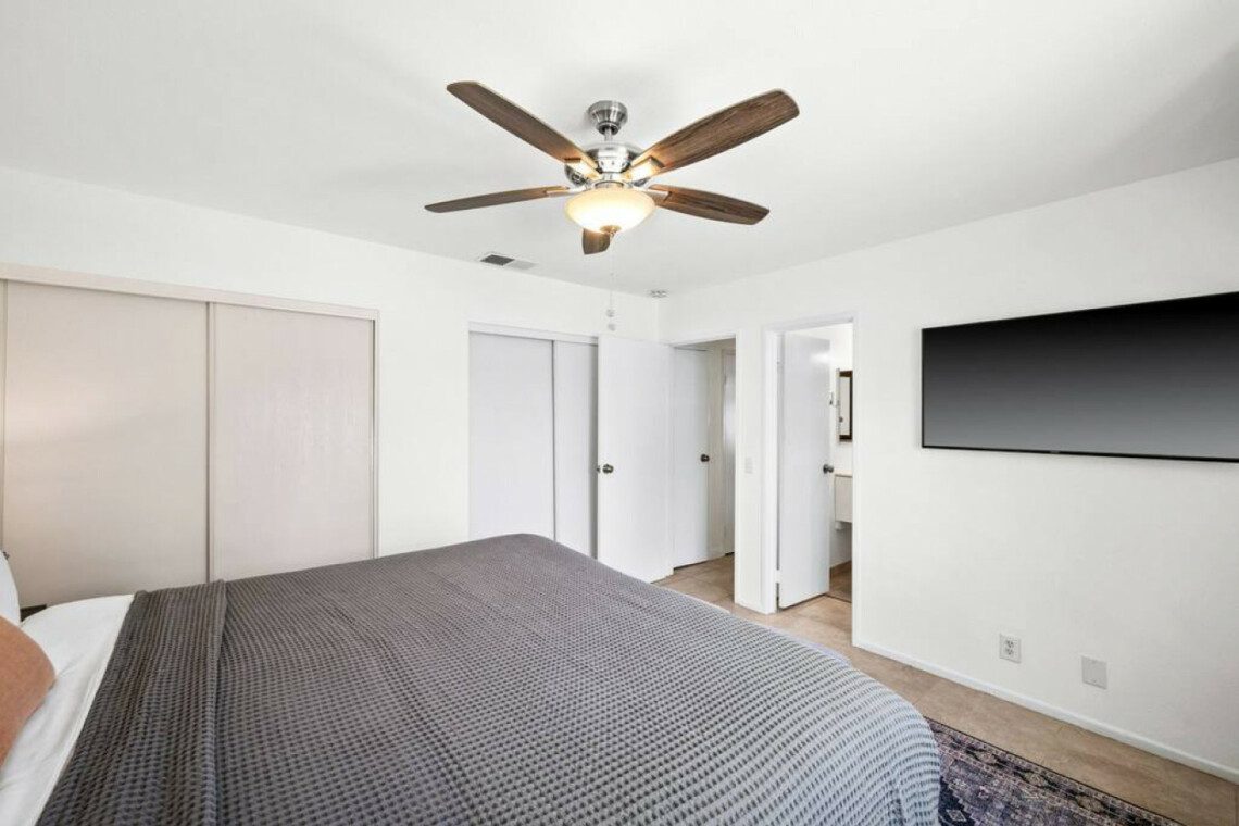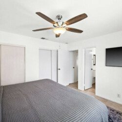 ●Bedroom #1 (primary): King bed, 50″ smart TV, double closet, luggage racks, nightstands, table lamps, ceiling fan, access to bathroom, *downstairs