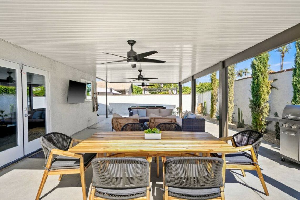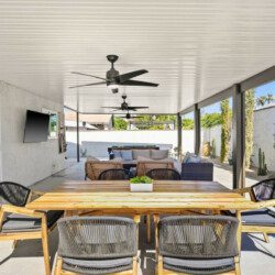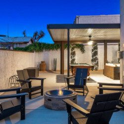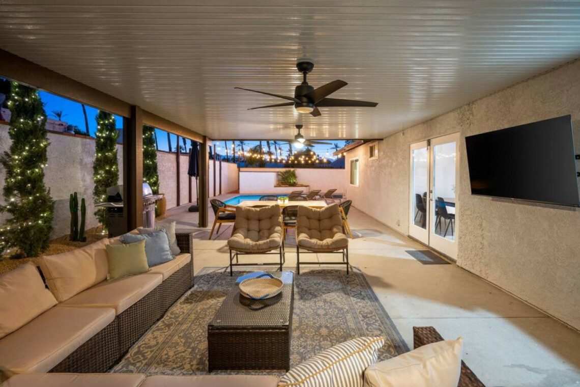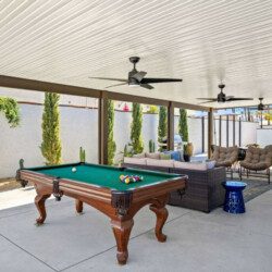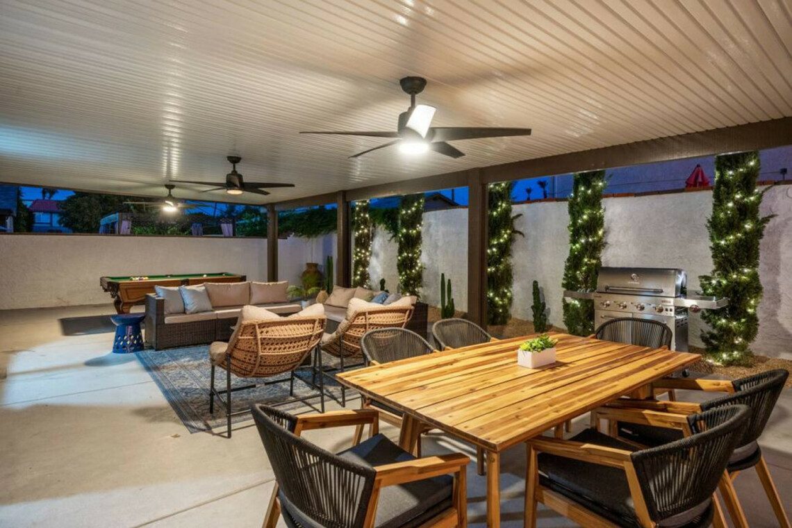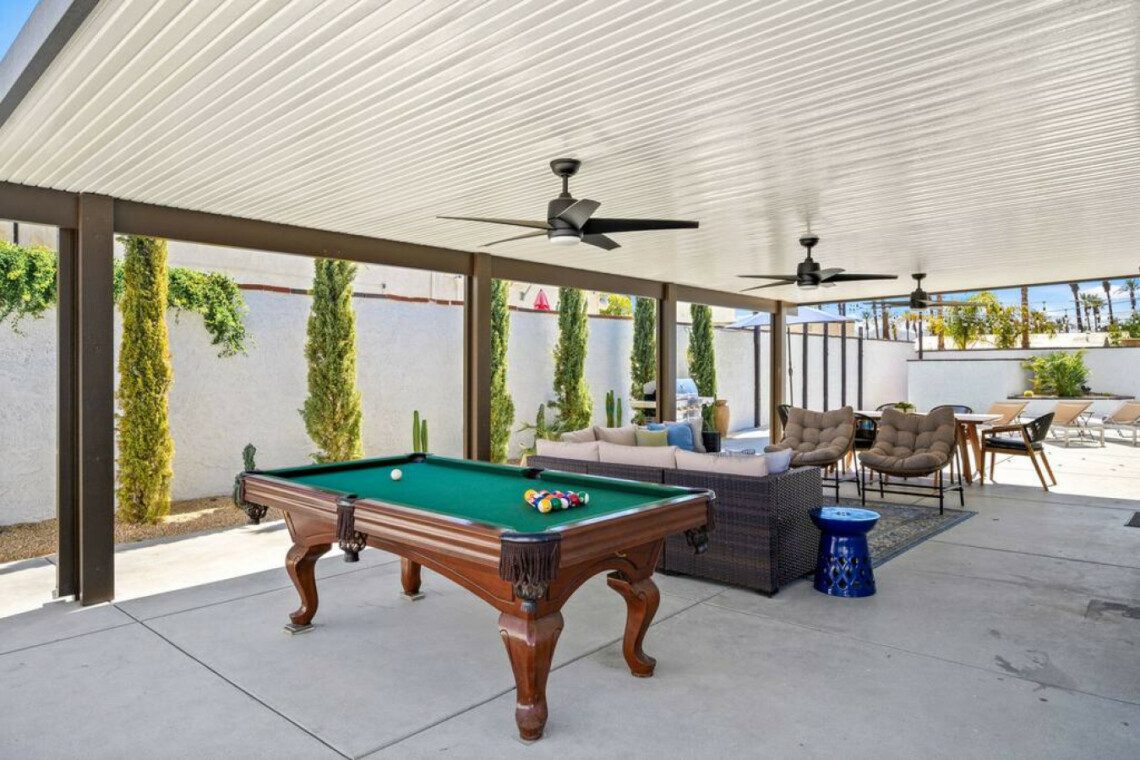 The backyard is what makes this home an entertainers paradise! The pool design is unique as it wraps around the house. There are plenty of pool lounge chairs for you to soak in the sun. The pool plaster was redone with new Lake Tahoe pebble tec giving it that enchanting blue water that is reminiscent of Lake Tahoe. The large patio area with ceiling fans covers the backyard to keep your friends and family cool from that hot desert sun. If you’ve ever been to Palm Springs, then you know some summer days get so hot it can be unbearable being outside without shade. All the backyard amenities from the firepit, billiards table, patio seating area, outdoor dining table, bbq grill and pool area are all connected. So whether you are swimming in the pool, eating some bbq, or playing billiards you are always with your friends and family! This Hidden Gem is an entertainers delight and will be your little slice of that Palm Springs lifestyle!