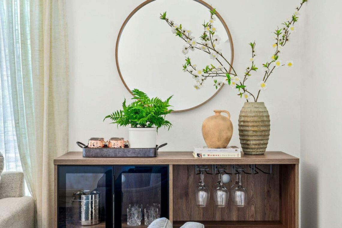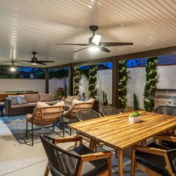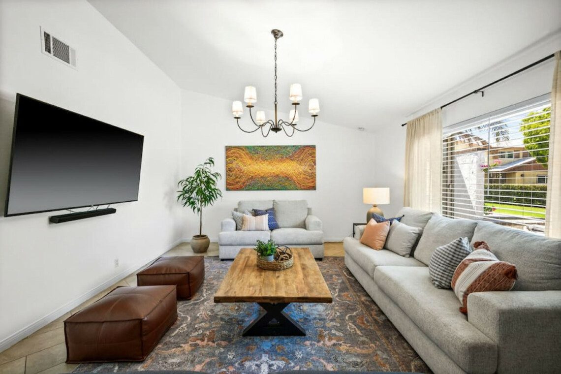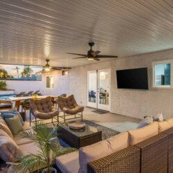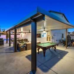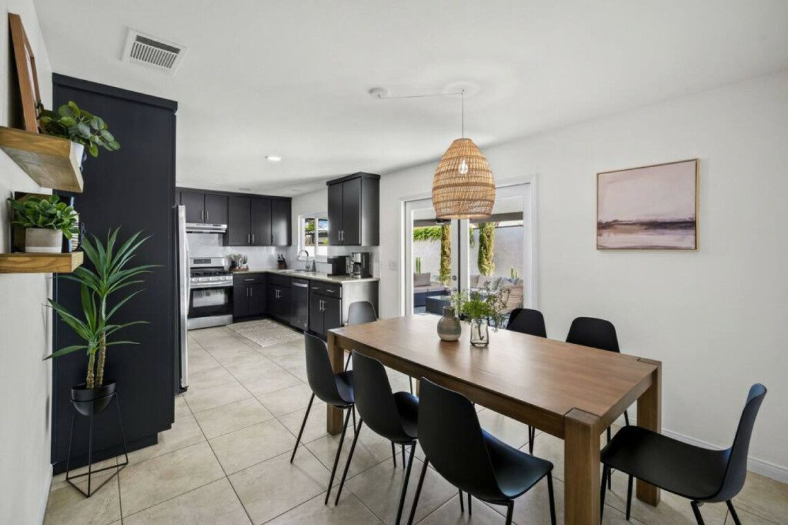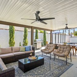 The backyard is what makes this home an entertainers paradise! The pool design is unique as it wraps around the house. There are plenty of pool lounge chairs for you to soak in the sun. The pool plaster was redone with new Lake Tahoe pebble tec giving it that enchanting blue water that is reminiscent of Lake Tahoe. The large patio area with ceiling fans covers the backyard to keep your friends and family cool from that hot desert sun. If you’ve ever been to Palm Springs, then you know some summer days get so hot it can be unbearable being outside without shade. All the backyard amenities from the firepit, billiards table, patio seating area, outdoor dining table, bbq grill and pool area are all connected. So whether you are swimming in the pool, eating some bbq, or playing billiards you are always with your friends and family! This Hidden Gem is an entertainers delight and will be your little slice of that Palm Springs lifestyle!