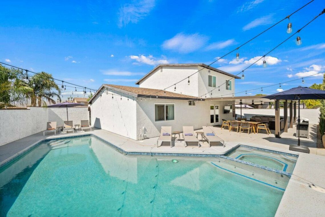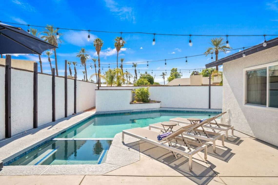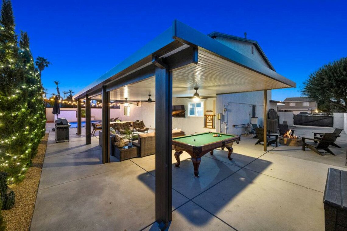 Welcome to the Hidden Gem! This home has been fully renovated inside and out to be the perfect vacation rental! Inside is a large living room with plenty of seating and 4 bedrooms ample enough to comfortably sleep 10-12 people. Outside enjoy the sparkling pebble tec pool and spa, and new LARGE patio area that will keep you cool during those hot desert days. Under the patio is a large seating area, patio dining table with grill and pool table! The backyard is a true entertainers paradise!