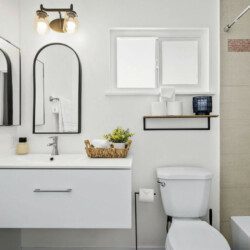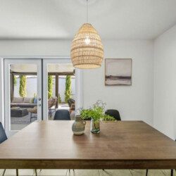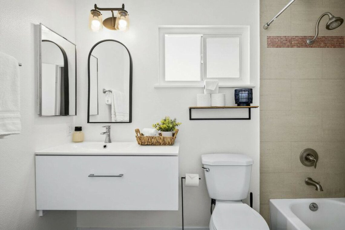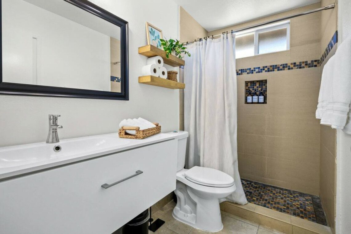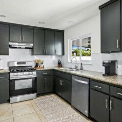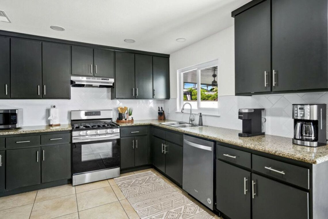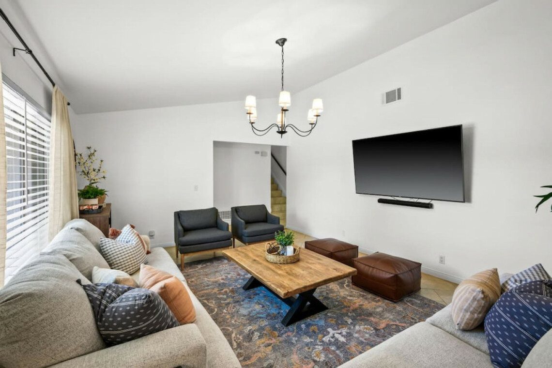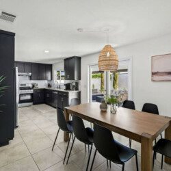 This two story home is impeccably designed with contemporary modern furnishings with the sole intention of being a premier vacation rental. There were no expenses spared as we wanted to make sure this was a luxury vacation rental with all the comforts of home. As you enter the home you are greeted by a large large living room with ample seating for 10 people. The living room has a large plush sofa and love seat that will want to make you melt and not want to get up! There are also two grey accent chairs and two Ottoman poufs. There is a 80 in Smart TV with a sound bar and a dry bay area for you to make some cocktails and enjoy your favorite movie. Underneath the bar area area are all your favorite board games from Monopoly, scrabble, Uno, Jenna and more. There are three bedrooms and a bathroom upstairs, and the master bedroom with en suite bathroom downstairs. With all the bedrooms our goal was to maximize comfort from the plush mattresses, comfortable pillows, high quality linen and easy to use lightning. The kitchen has been beautifully redesigned with stainless steel appliances and is fully stocked for you to make ANY meal you want! There is also a modern dining table with seating for 8.