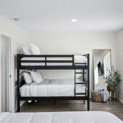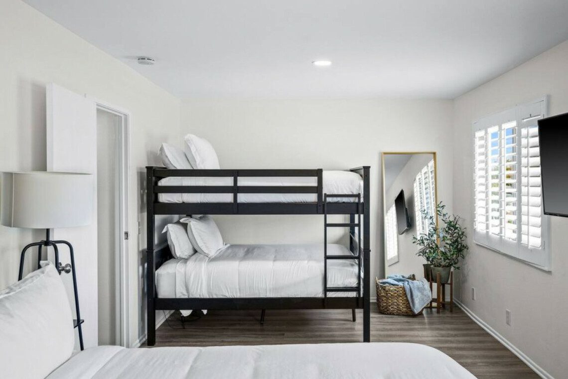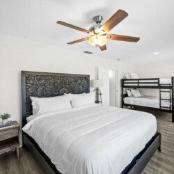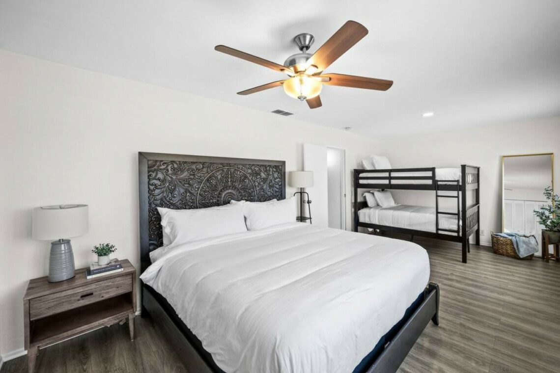 ●Bedroom #2: King bed, full over full bunk bed (top bunk for 2 children or 1 adult), closet, luggage rack, ceiling fans, night stands, table lamp, 50″ smart TV. *This bedroom can easily sleep 6 with 2 people on each full bed and another 2 on the King bed. *upstairs