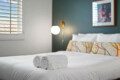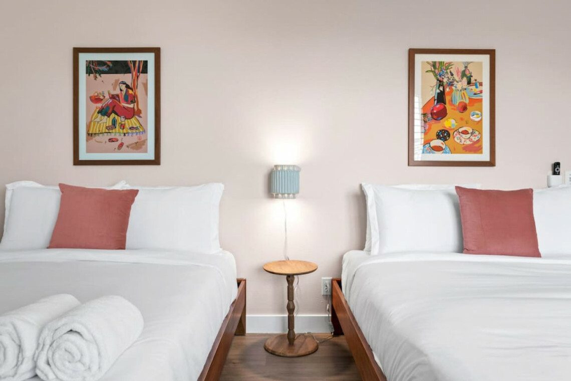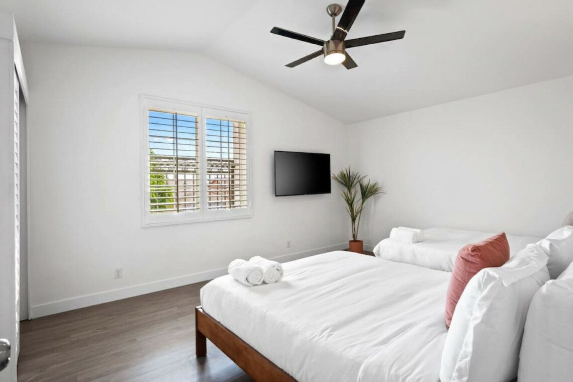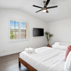 ●Bedroom #4: Double queen beds, nightstand, sconce, 55″ smart tv, closet, luggage rack, ceiling fan, *upstairs