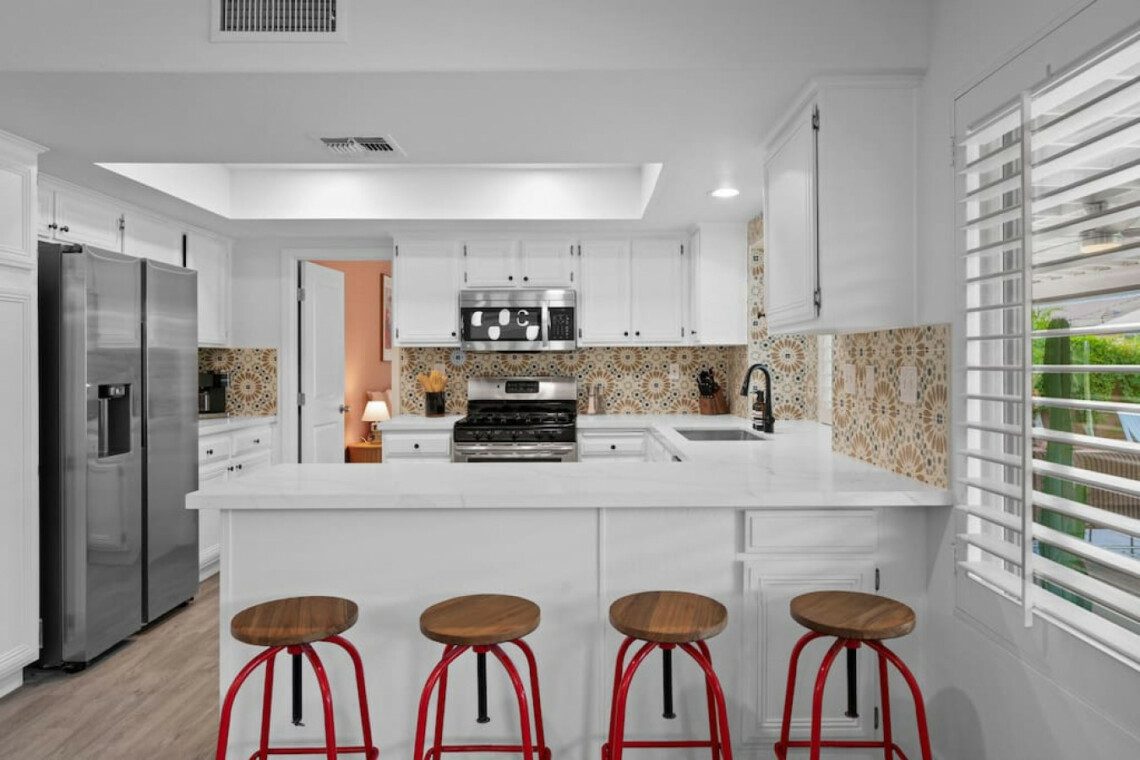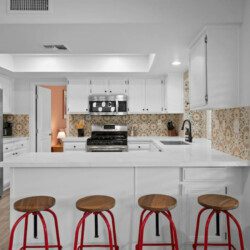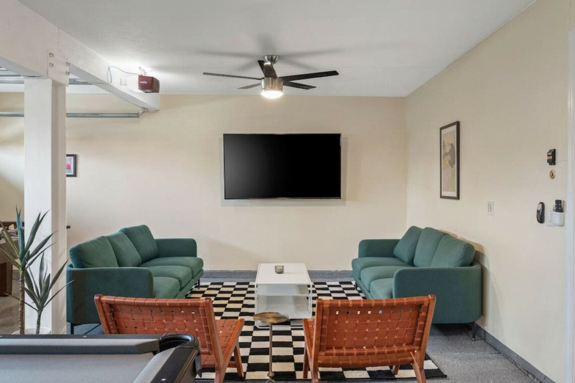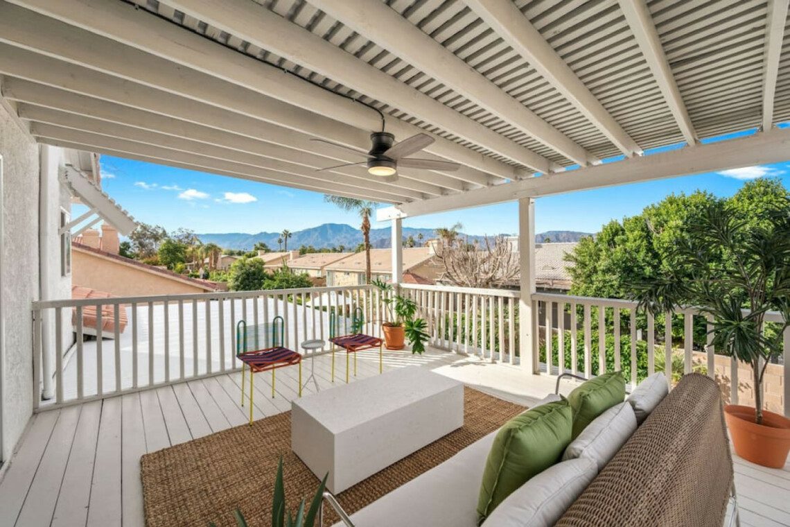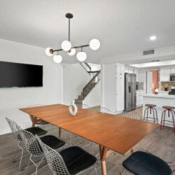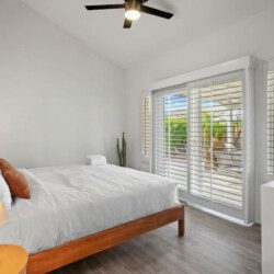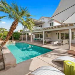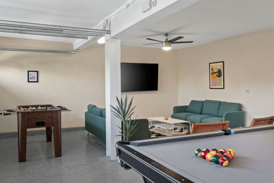 The Modern Indio provides a wonderful retreat for large groups looking for a comfortable and relaxing space in Coachella Valley. The two-story home provides 6 bedrooms and 3 bathrooms allowing for up to 18 guests. Each bedroom with the exception of the bunk room features a 50-55″ smart tv connected to all popular streaming services (no cable provided). The upstairs master bedroom offers a king bed, an ensuite bath with a large walk-in closet, designated office space, and access to the balcony overlooking the pool and nearby mountains. There are 3 additional bedrooms upstairs share a full bathroom; 2 rooms offering a queen bed and the last bedroom offering 2 queen beds. The remaining 2 bedrooms are downstairs and share a hallway bathroom. One bedroom has a king bed and access to the backyard via a sliding glass door and the other a full over full bunk bed with a twin trundle. The kitchen has stainless steel appliances and is fully stocked with all the necessities needed for prepare a full family meal. The garage has been converted to a spacious game room with an 8 feet billiard table, foos-ball table, a mounted connect four, and a 75″ smart tv. There are plenty of space to spread out whether in the game room, living room, or dining room.