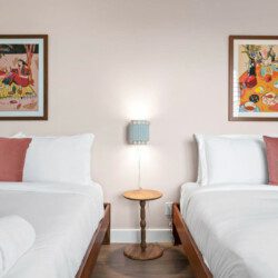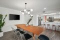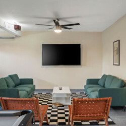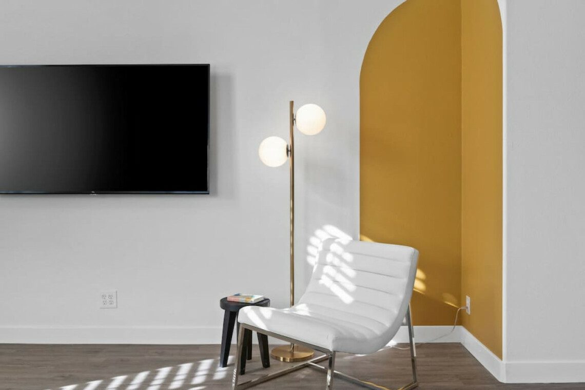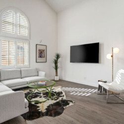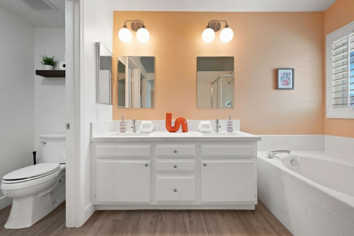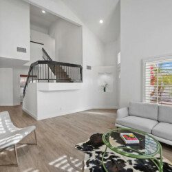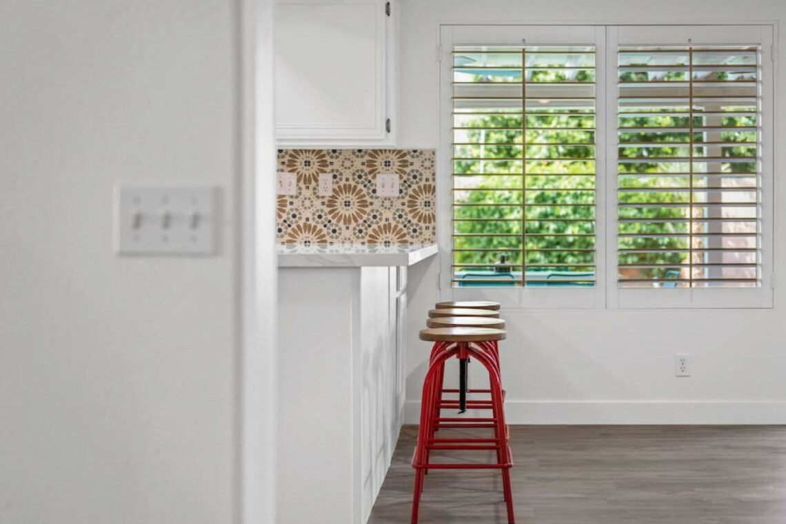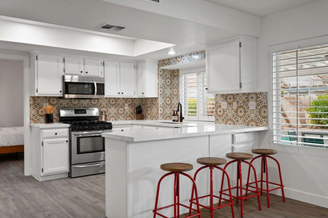 The Modern Indio provides a wonderful retreat for large groups looking for a comfortable and relaxing space in Coachella Valley. The two-story home provides 6 bedrooms and 3 bathrooms allowing for up to 18 guests. Each bedroom with the exception of the bunk room features a 50-55″ smart tv connected to all popular streaming services (no cable provided). The upstairs master bedroom offers a king bed, an ensuite bath with a large walk-in closet, designated office space, and access to the balcony overlooking the pool and nearby mountains. There are 3 additional bedrooms upstairs share a full bathroom; 2 rooms offering a queen bed and the last bedroom offering 2 queen beds. The remaining 2 bedrooms are downstairs and share a hallway bathroom. One bedroom has a king bed and access to the backyard via a sliding glass door and the other a full over full bunk bed with a twin trundle. The kitchen has stainless steel appliances and is fully stocked with all the necessities needed for prepare a full family meal. The garage has been converted to a spacious game room with an 8 feet billiard table, foos-ball table, a mounted connect four, and a 75″ smart tv. There are plenty of space to spread out whether in the game room, living room, or dining room.