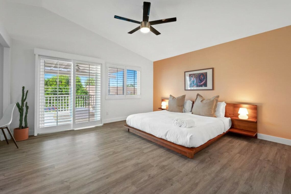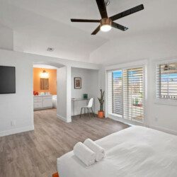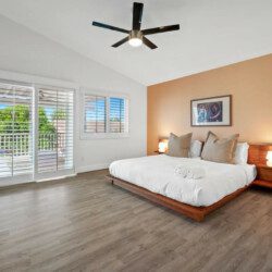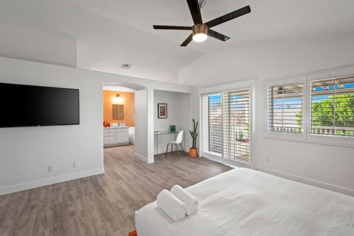 ●Bedroom #1 (primary): King bed with built-in nightstands, ensuite bath, 55″ smart tv, designated work space, walk-in closet, luggage rack, ceiling fan, access to private balcony with additional seating space, *upstairs