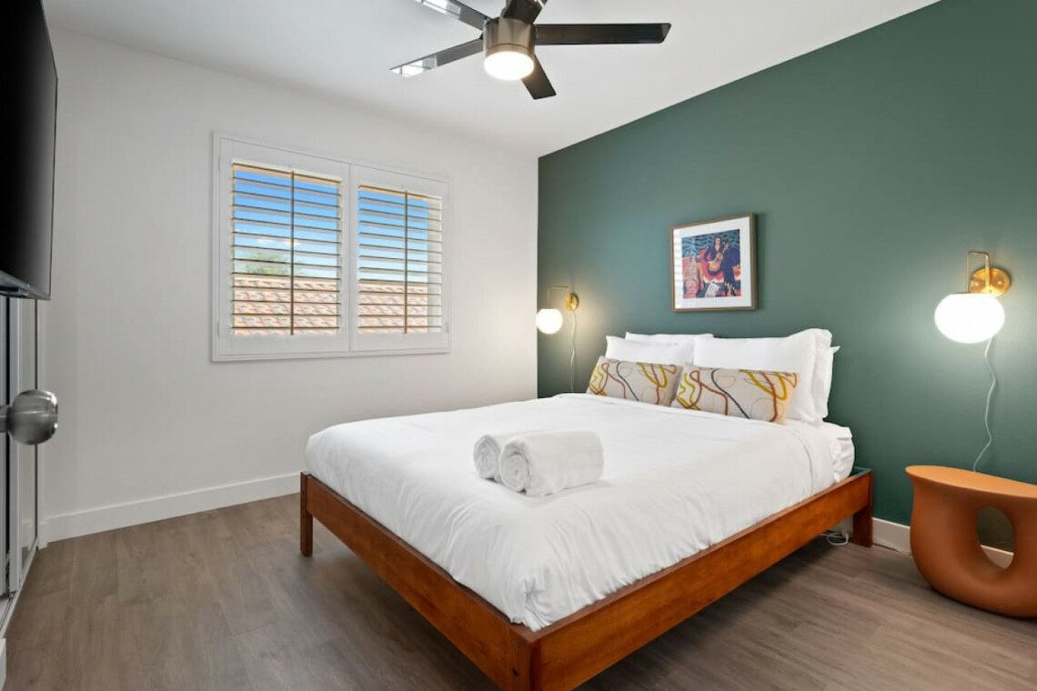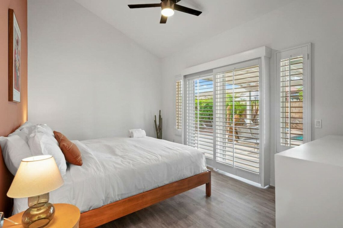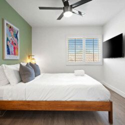 ●Bedroom #5: King bed, nightstands, table lamps, dresser, 50″ smart tv, ceiling fan, sliding door with access to yard, *downstairs