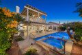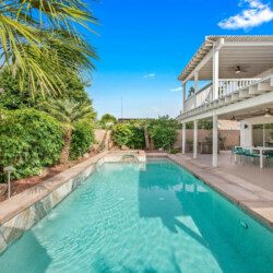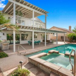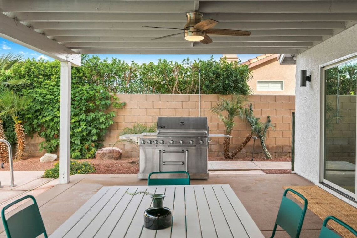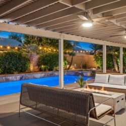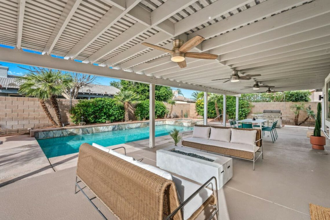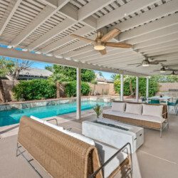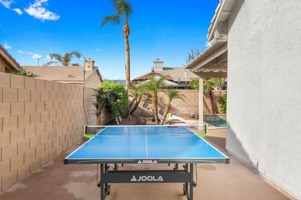 The backyard has a large pergola with 4 ceiling fans to provide shelter from the desert sun. The yard has 2 sofas, a propane bon fire pit, 8-person table for al-fresco dining, a couple of lounge chaises, and lastly a professional size table tennis. The pool and spa can be heated (additional cost) and controlled through an app on any android/apple phone.